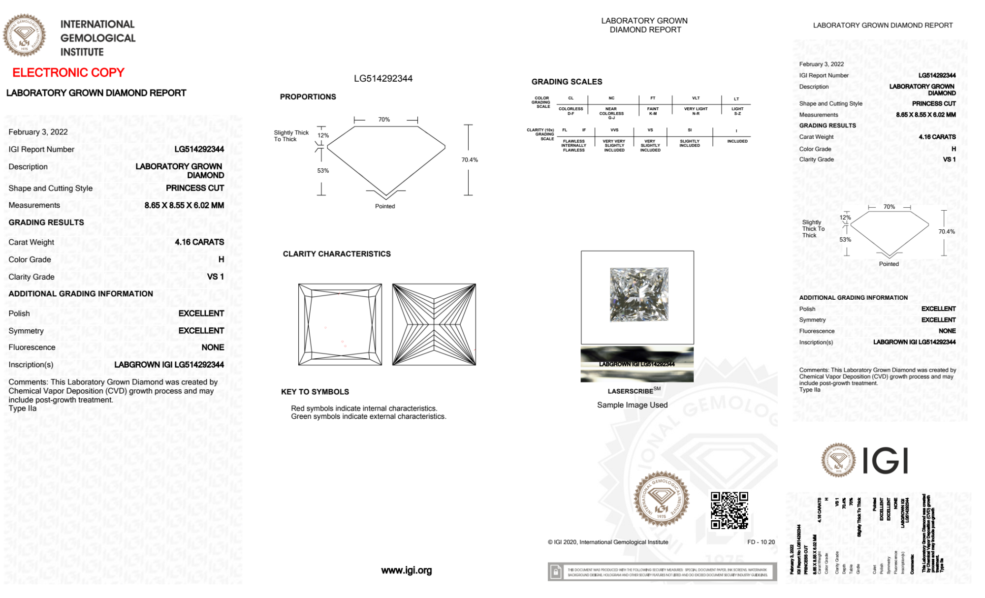 Your 4.16 carat Princess lab diamond is graded H color (Near Colorless), and you can read more about H color diamonds here.