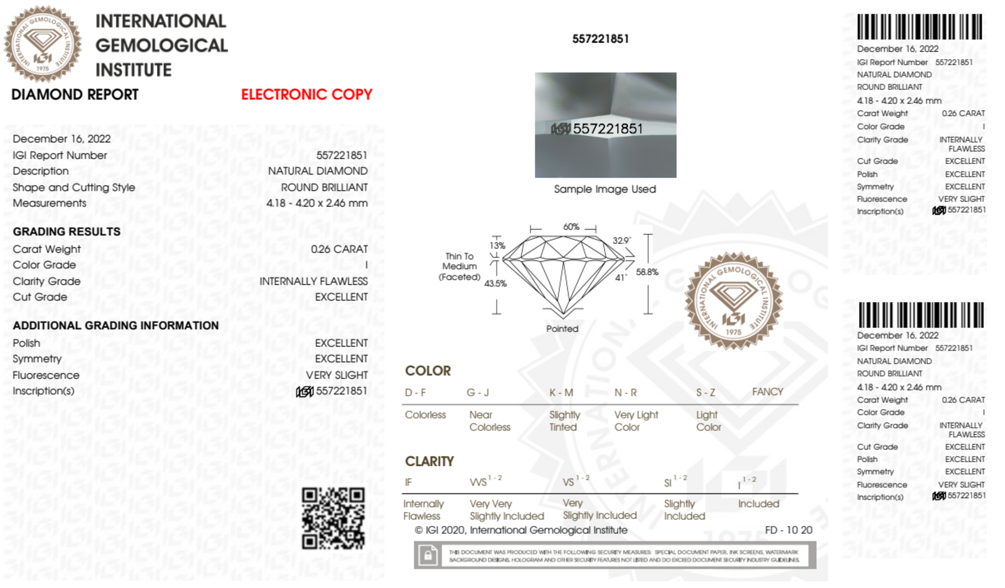 Your 0.26 carat Round natural diamond is graded IF clarity, which stands for Internally Flawless. Read more about IF clarity diamonds here, or learn more about diamond clarity in general here.
