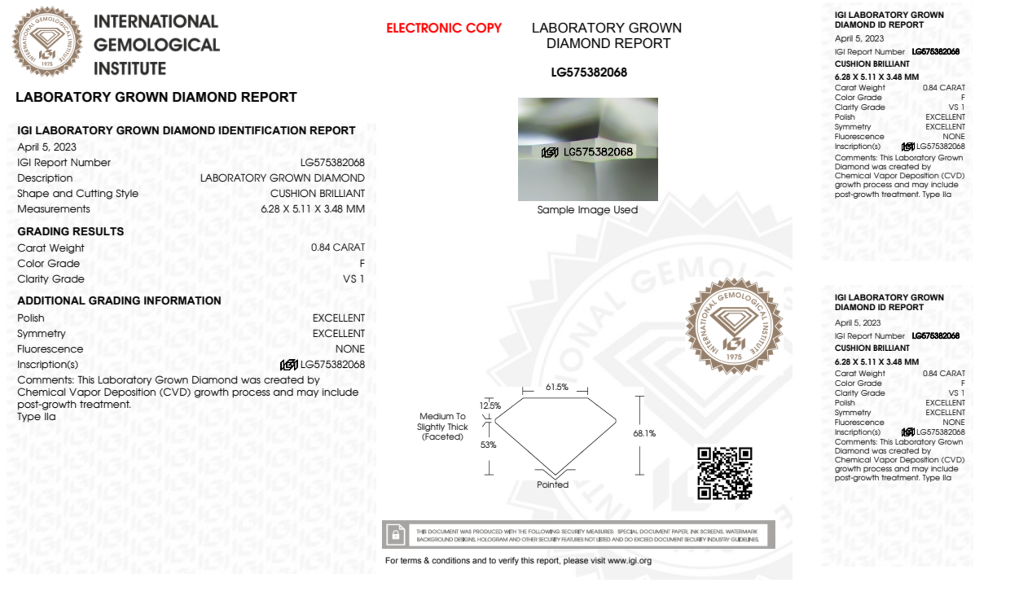Your 0.84 carat Cushion lab diamond is graded F color (Colorless), and you can read more about F color diamonds here.