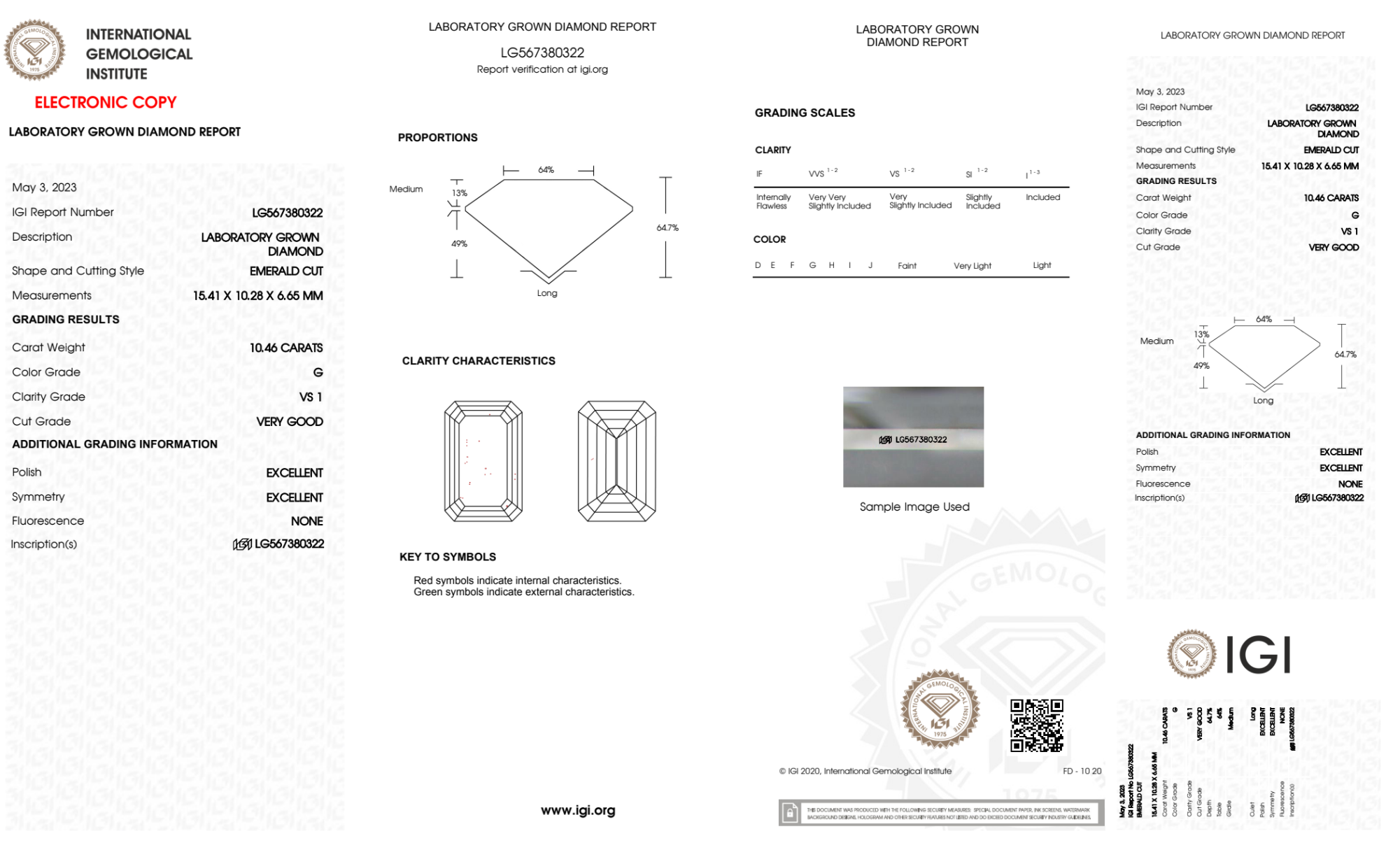 Your 10.46 carat Emerald lab diamond is graded VS1 clarity, which stands for Very Slightly Included 1. Read more about VS1 clarity diamonds here, or learn more about diamond clarity in general here.