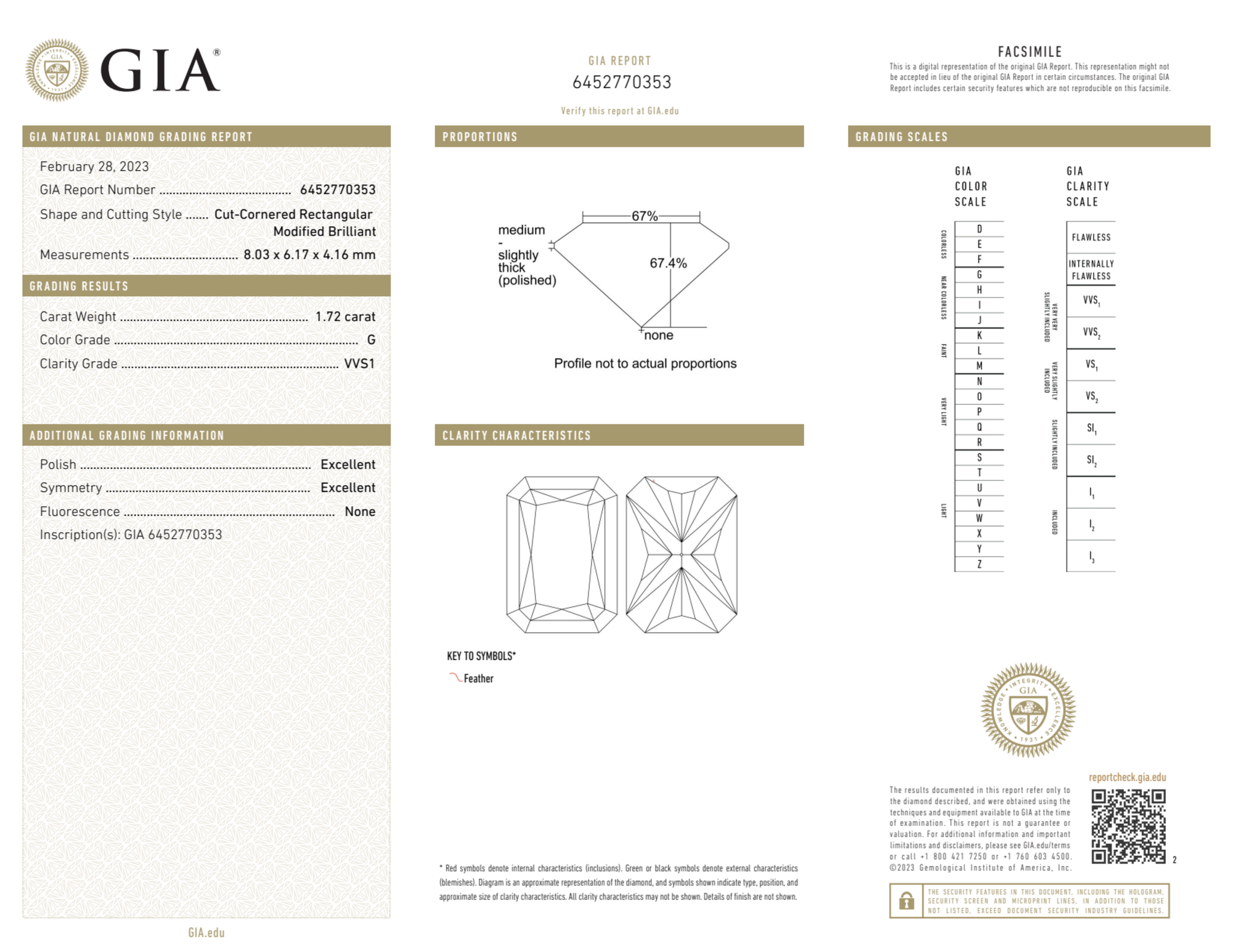 Your 1.72 carat Radiant natural diamond is graded VVS1 clarity, which stands for Very Very Slightly Included 1. Read more about VVS1 clarity diamonds here, or learn more about diamond clarity in general here.