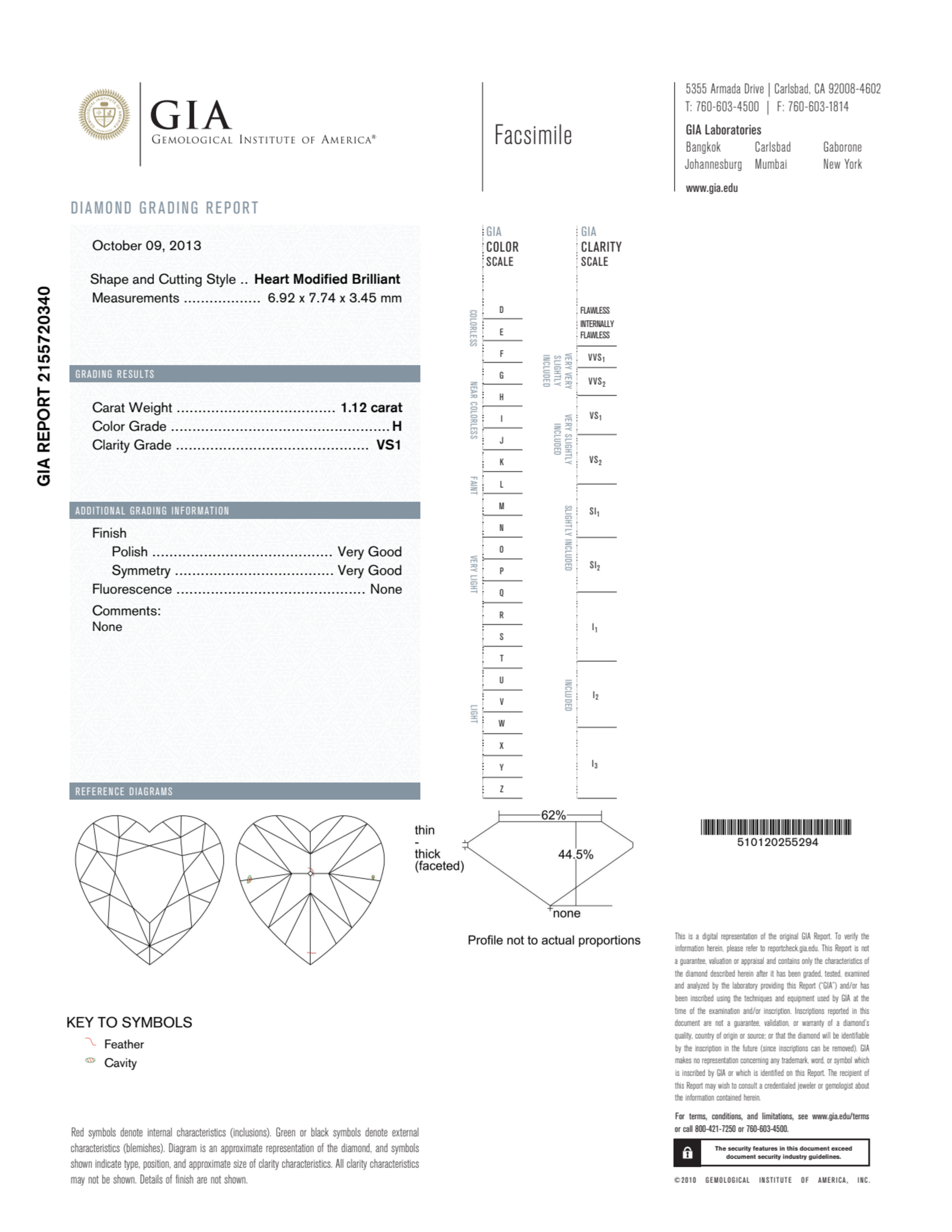 Your 1.12 carat Heart natural diamond is graded VS1 clarity, which stands for Very Slightly Included 1. Read more about VS1 clarity diamonds here, or learn more about diamond clarity in general here.