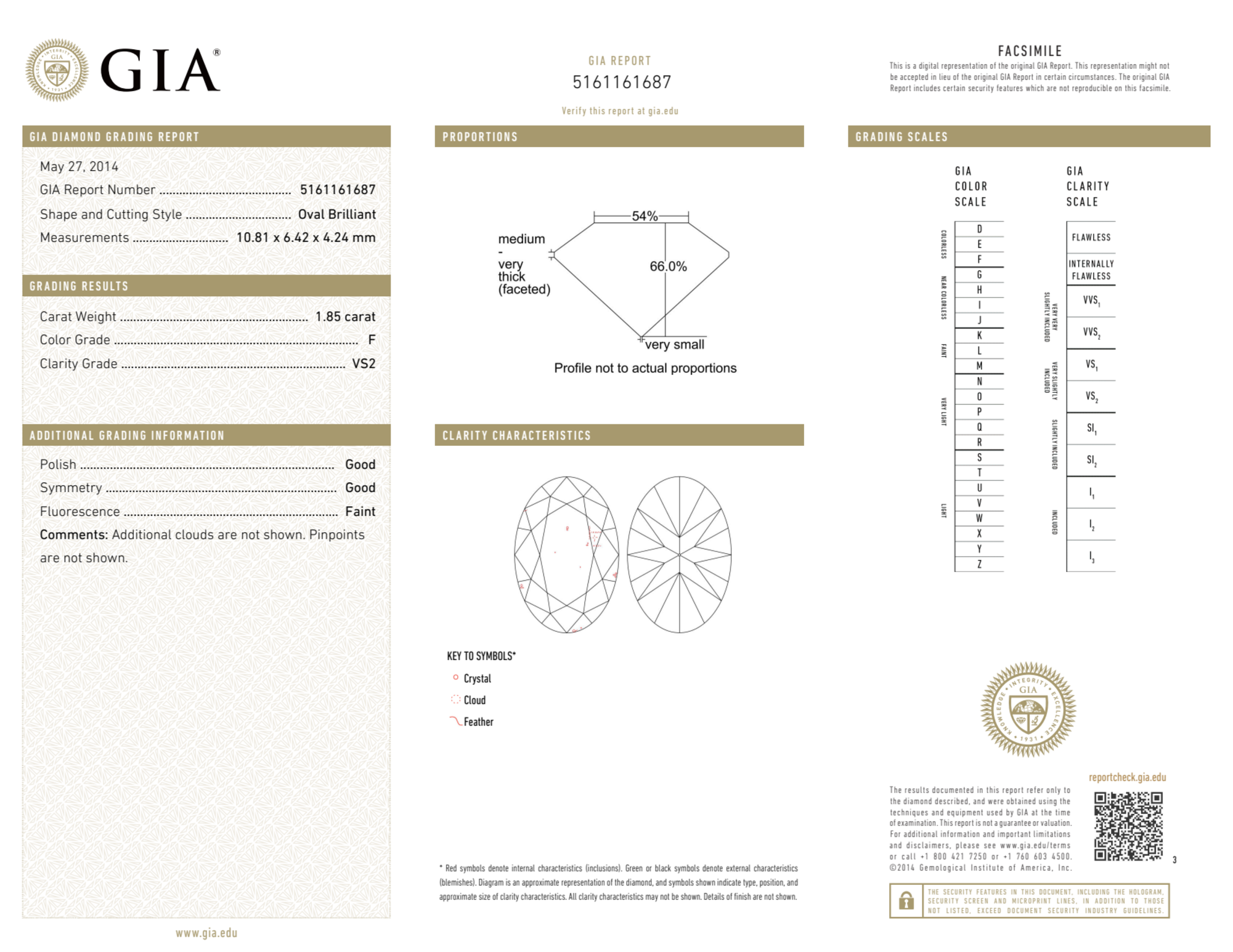 Your 1.85 carat Oval natural diamond is graded VS2 clarity, which stands for Very Slightly Included 2. Read more about VS2 clarity diamonds here, or learn more about diamond clarity in general here.