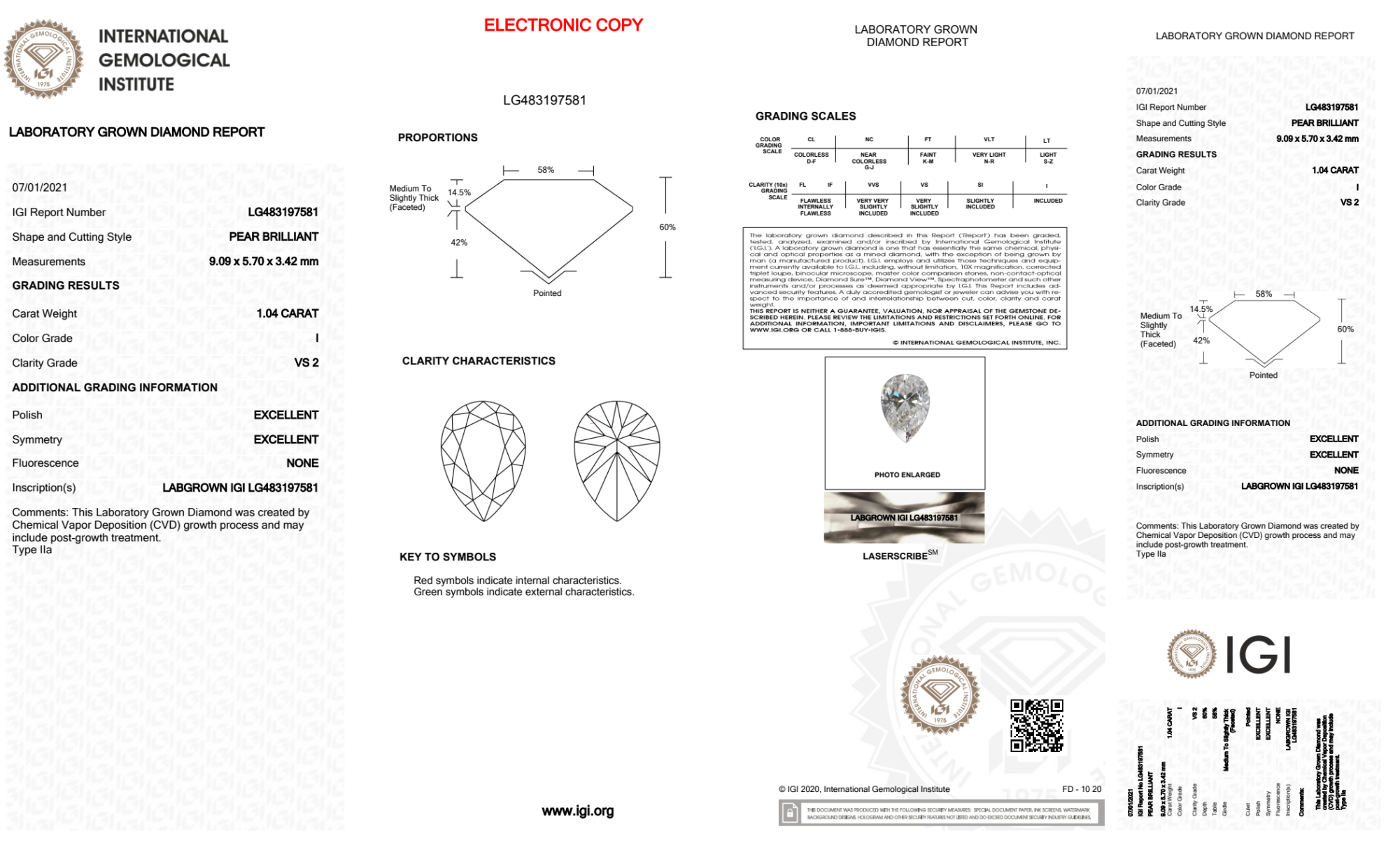 Your 1.04 carat Pear lab diamond is graded I color (Near Colorless), and you can read more about I color diamonds here.