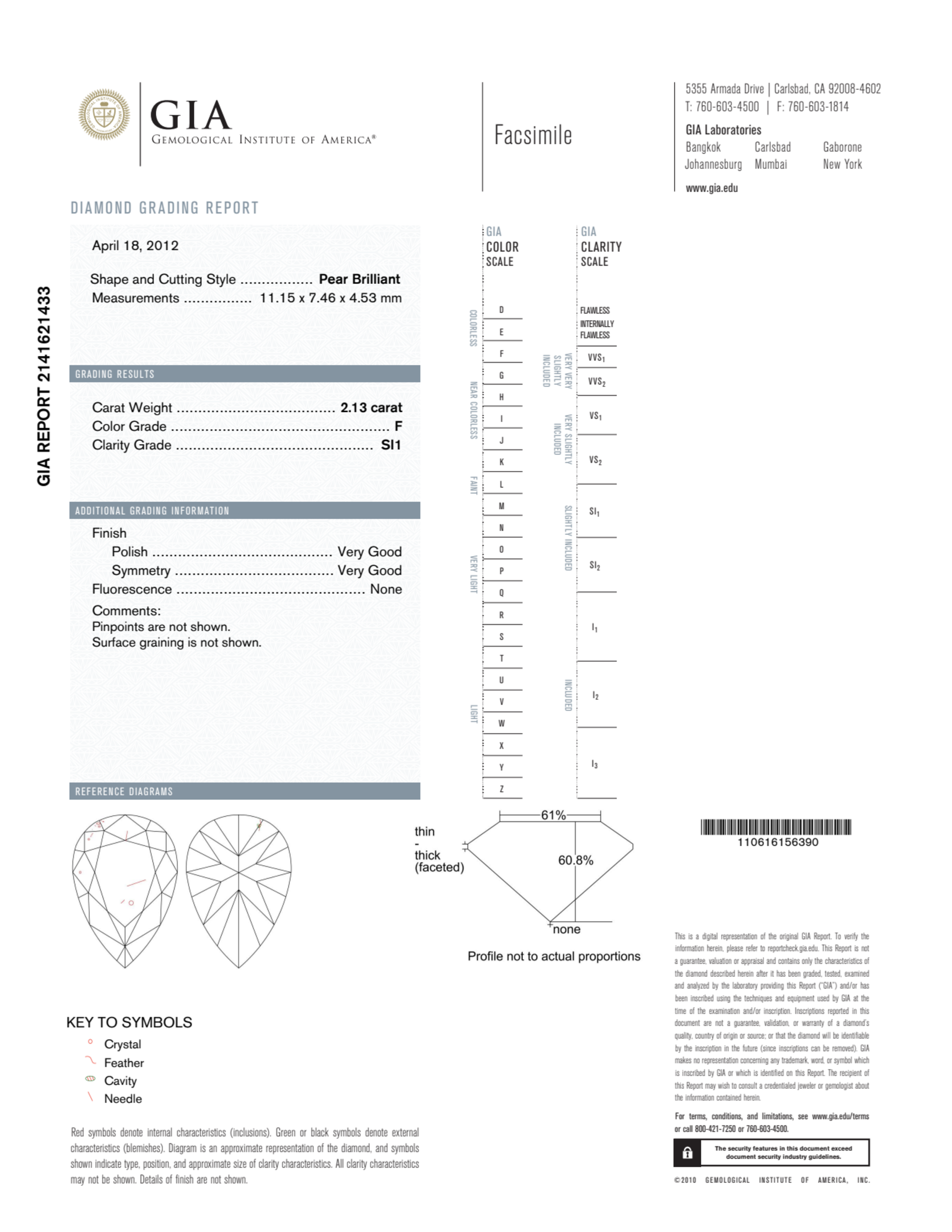 Your 2.13 carat Pear natural diamond is graded F color (Colorless), and you can read more about F color diamonds here.