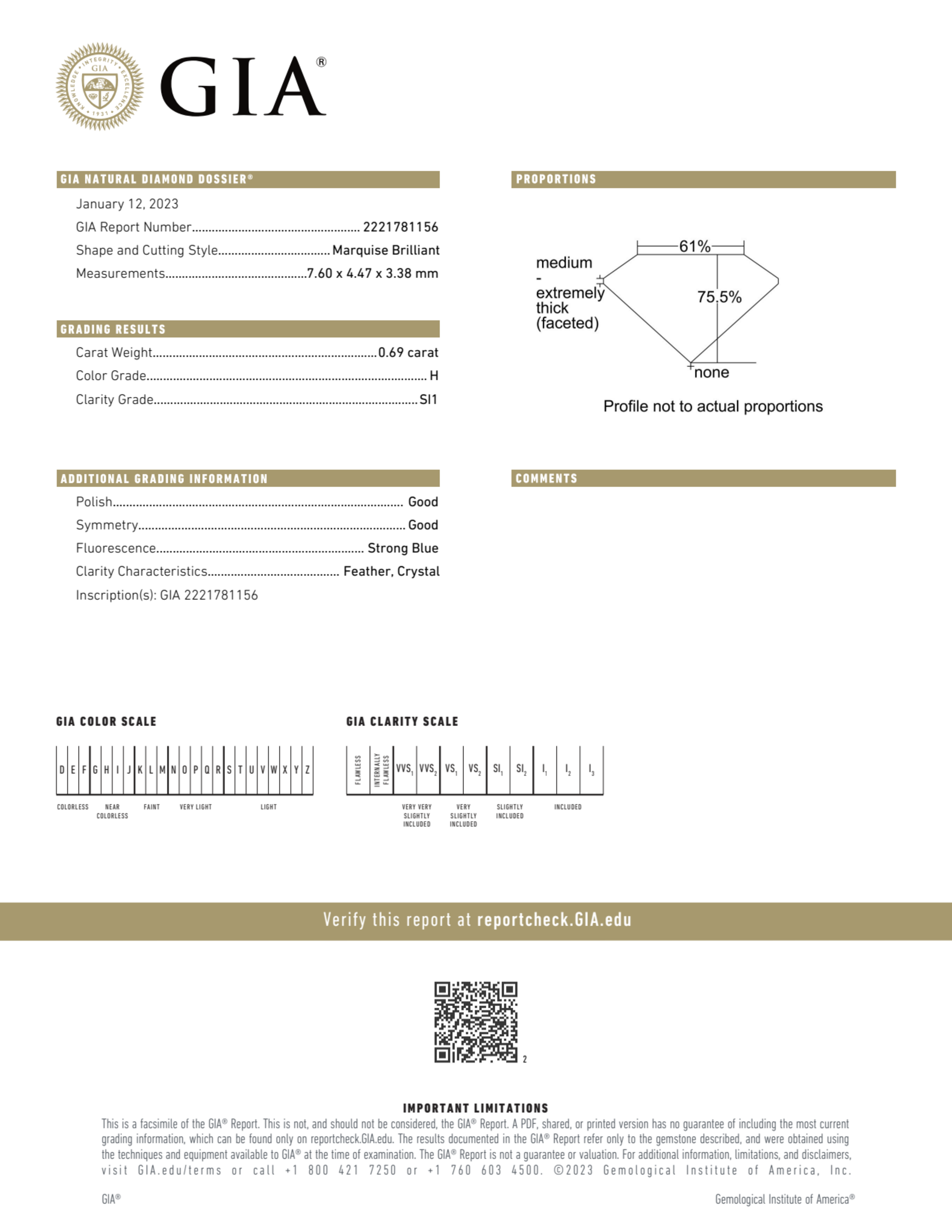 Your 0.69 carat Marquise natural diamond is graded SI1 clarity, which stands for Slightly Included 1. Read more about SI1 clarity diamonds here, or learn more about diamond clarity in general here.