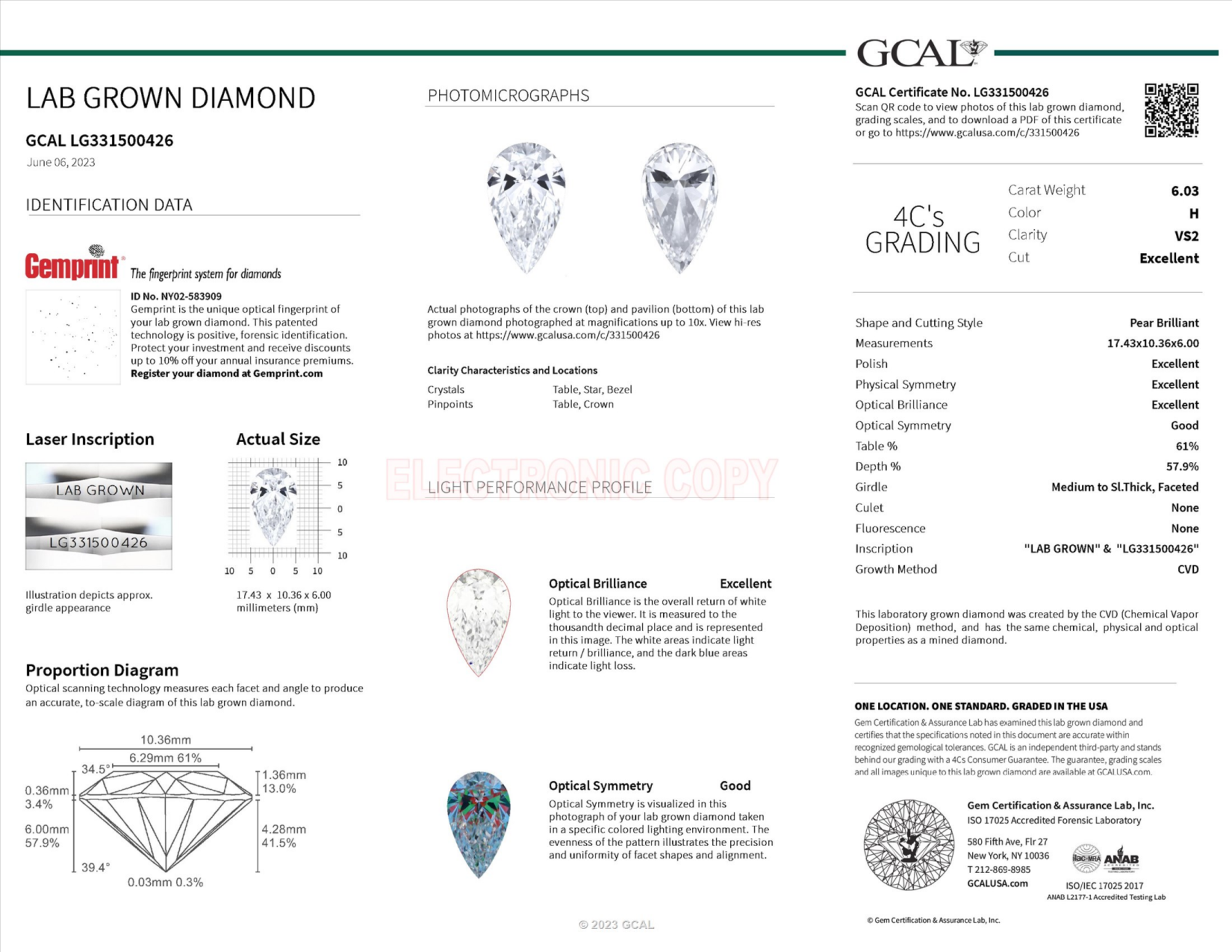 Your 6.03 carat Pear lab diamond is graded H color (Near Colorless), and you can read more about H color diamonds here.