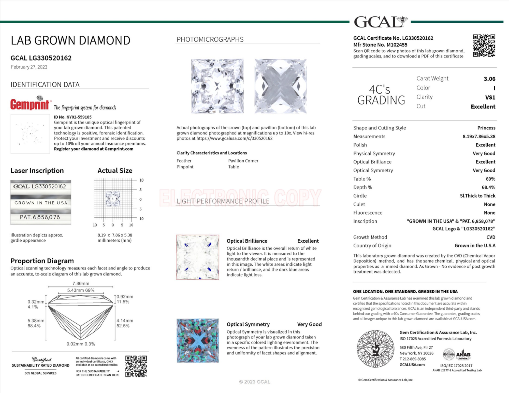 Your 3.06 carat Princess lab diamond is graded VS1 clarity, which stands for Very Slightly Included 1. Read more about VS1 clarity diamonds here, or learn more about diamond clarity in general here.