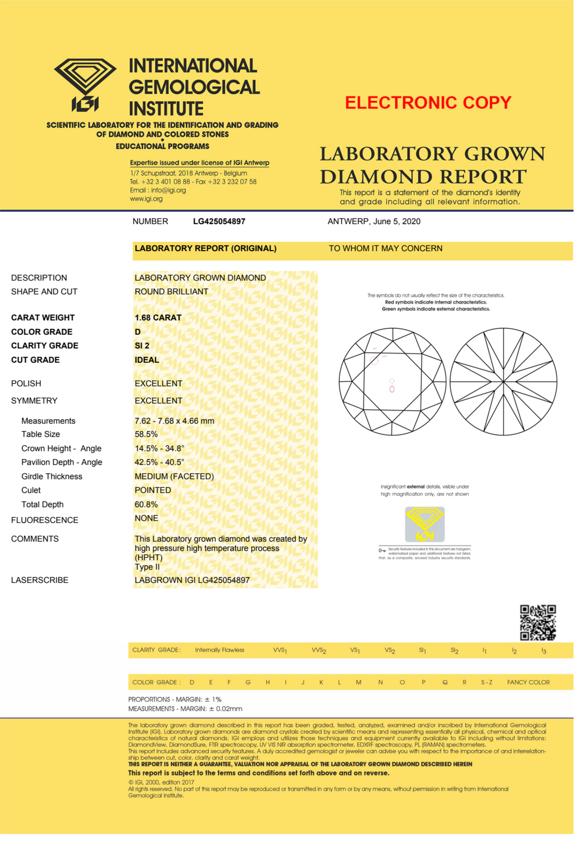 Your 1.68 carat Round lab diamond is graded SI2 clarity, which stands for Slightly Included 2. Read more about SI2 clarity diamonds here, or learn more about diamond clarity in general here.