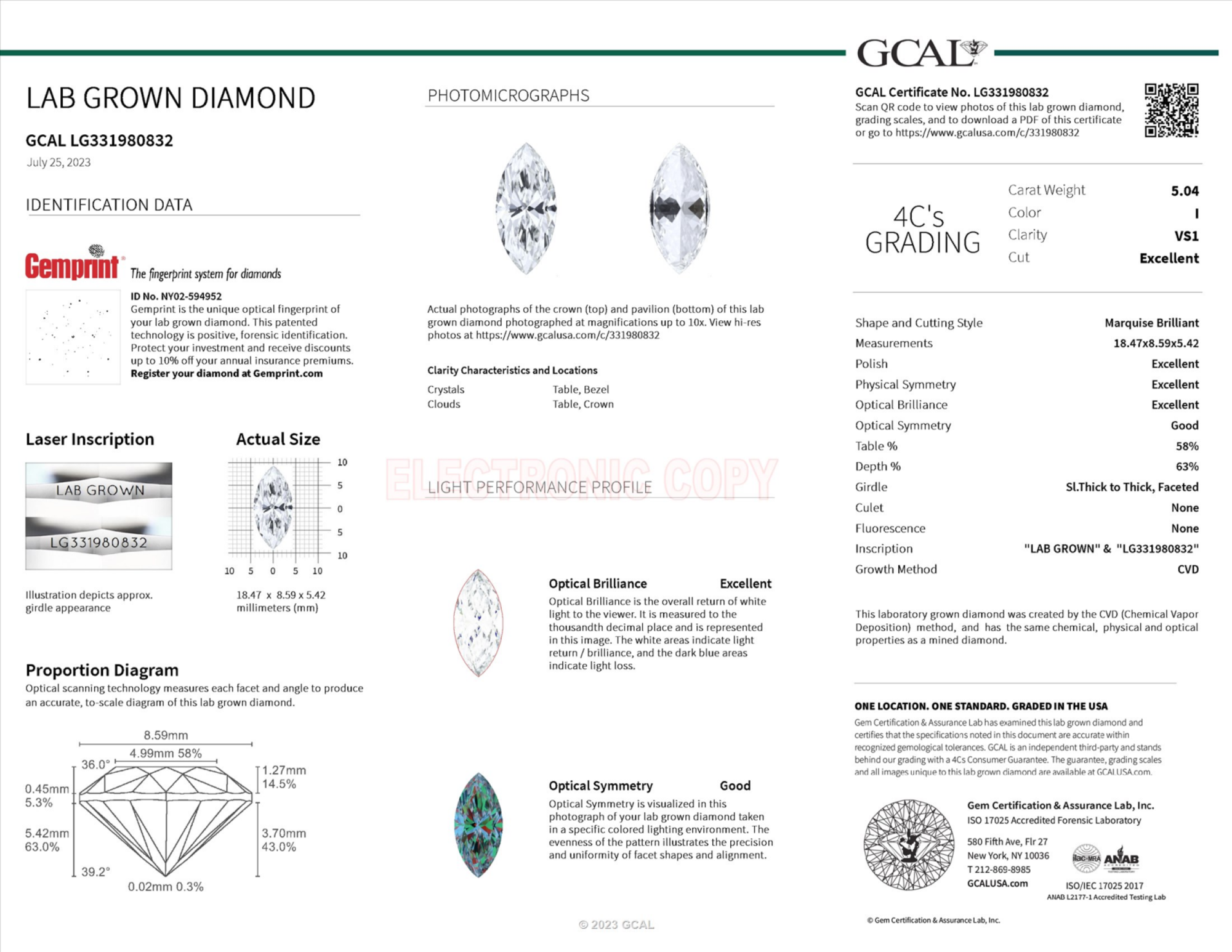 Your 5.04 carat Marquise lab diamond is graded VS1 clarity, which stands for Very Slightly Included 1. Read more about VS1 clarity diamonds here, or learn more about diamond clarity in general here.