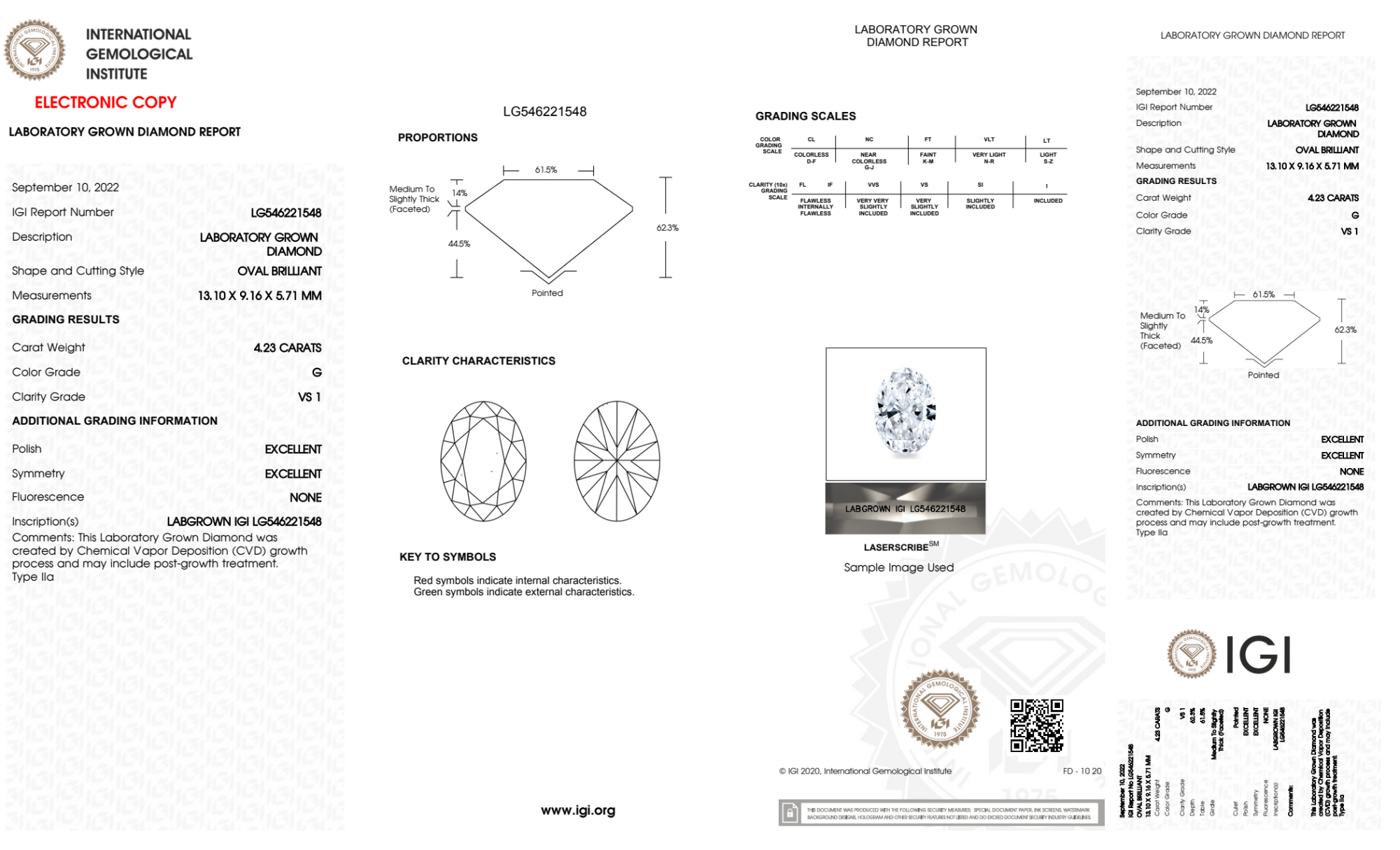 Your 4.23 carat Oval lab diamond is graded G color (Near Colorless), and you can read more about G color diamonds here.