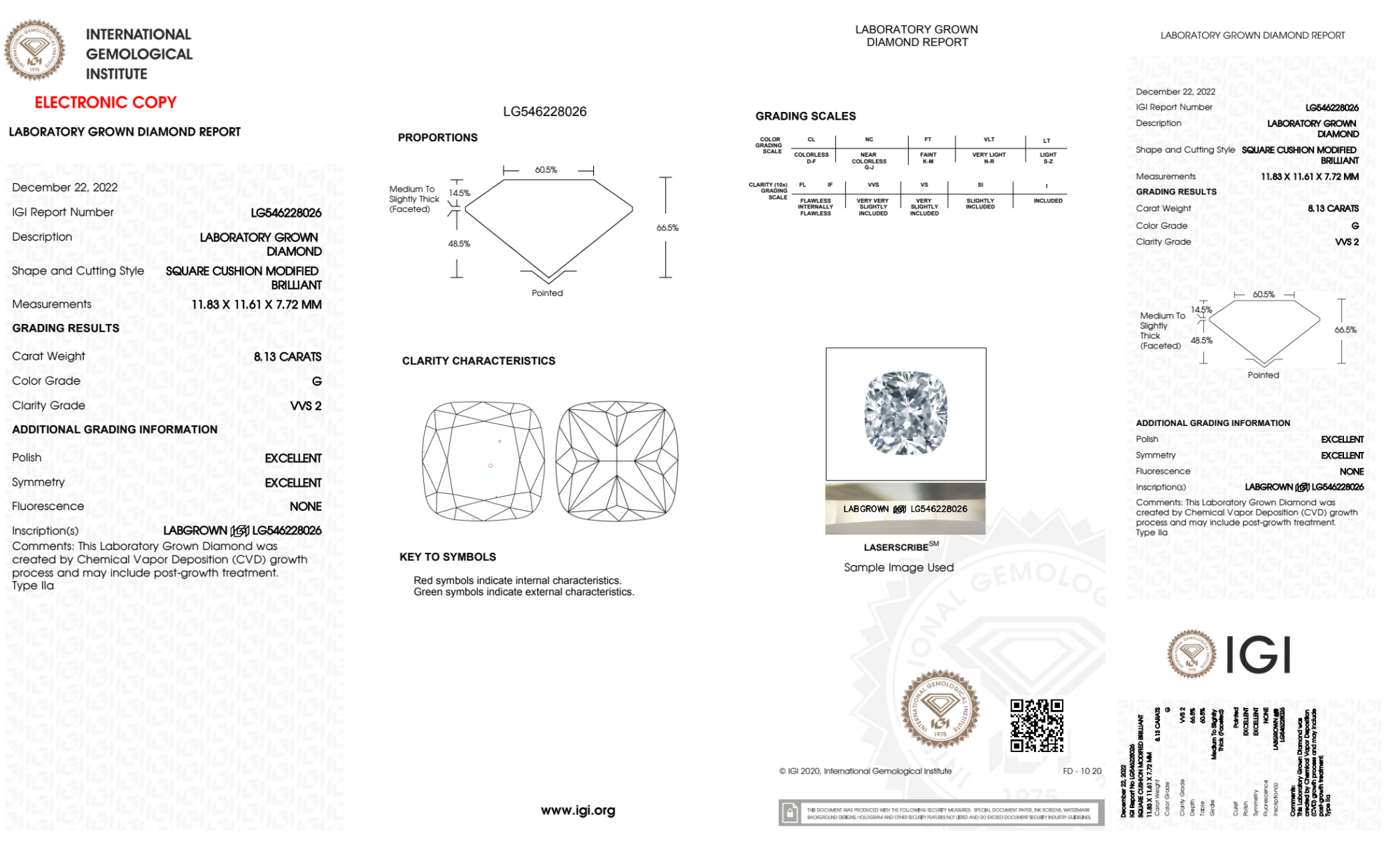 Your 8.13 carat Cushion lab diamond is graded G color (Near Colorless), and you can read more about G color diamonds here.