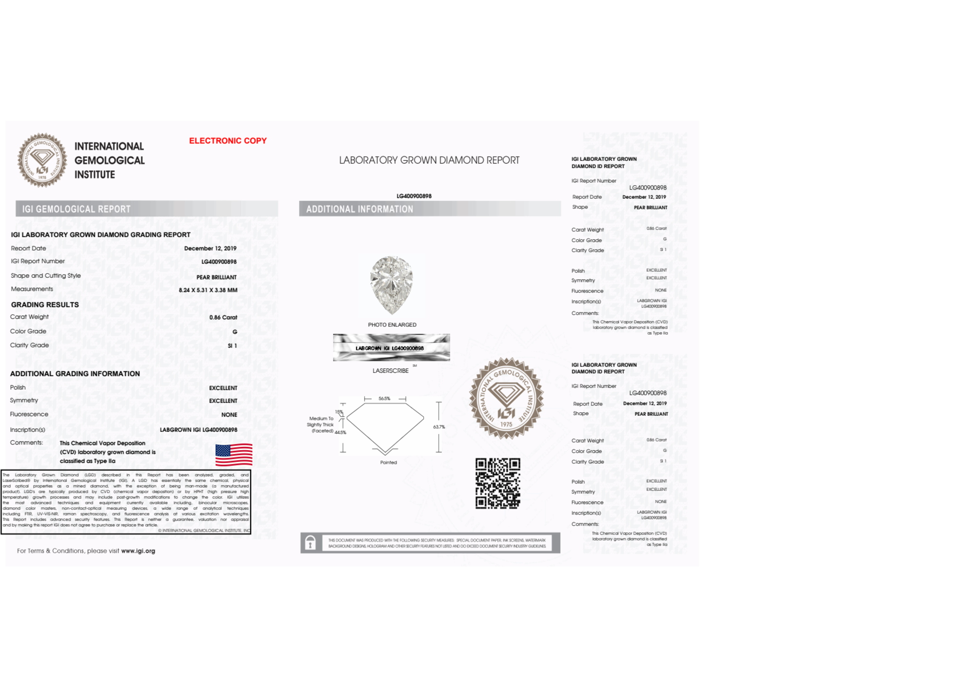 Your 0.86 carat Pear lab diamond is graded G color (Near Colorless), and you can read more about G color diamonds here.