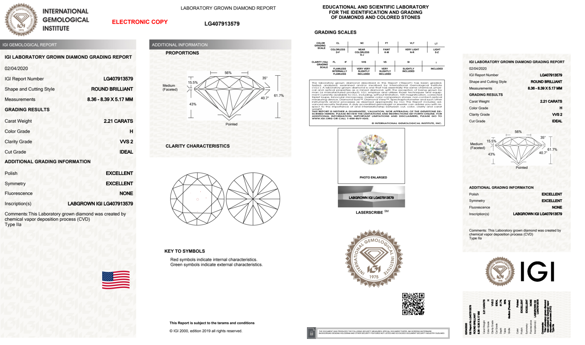 Your 2.21 carat Round lab diamond is graded H color (Near Colorless), and you can read more about H color diamonds here.