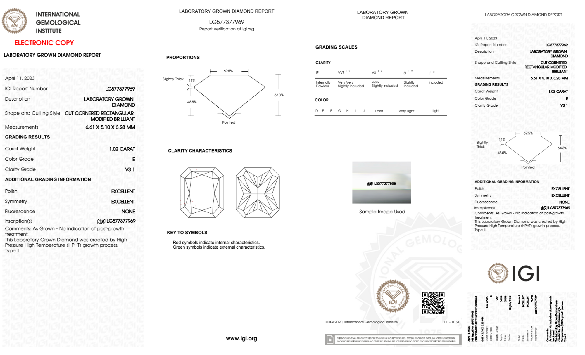 Your 1.02 carat Radiant lab diamond is graded E color (Colorless), and you can read more about E color diamonds here.