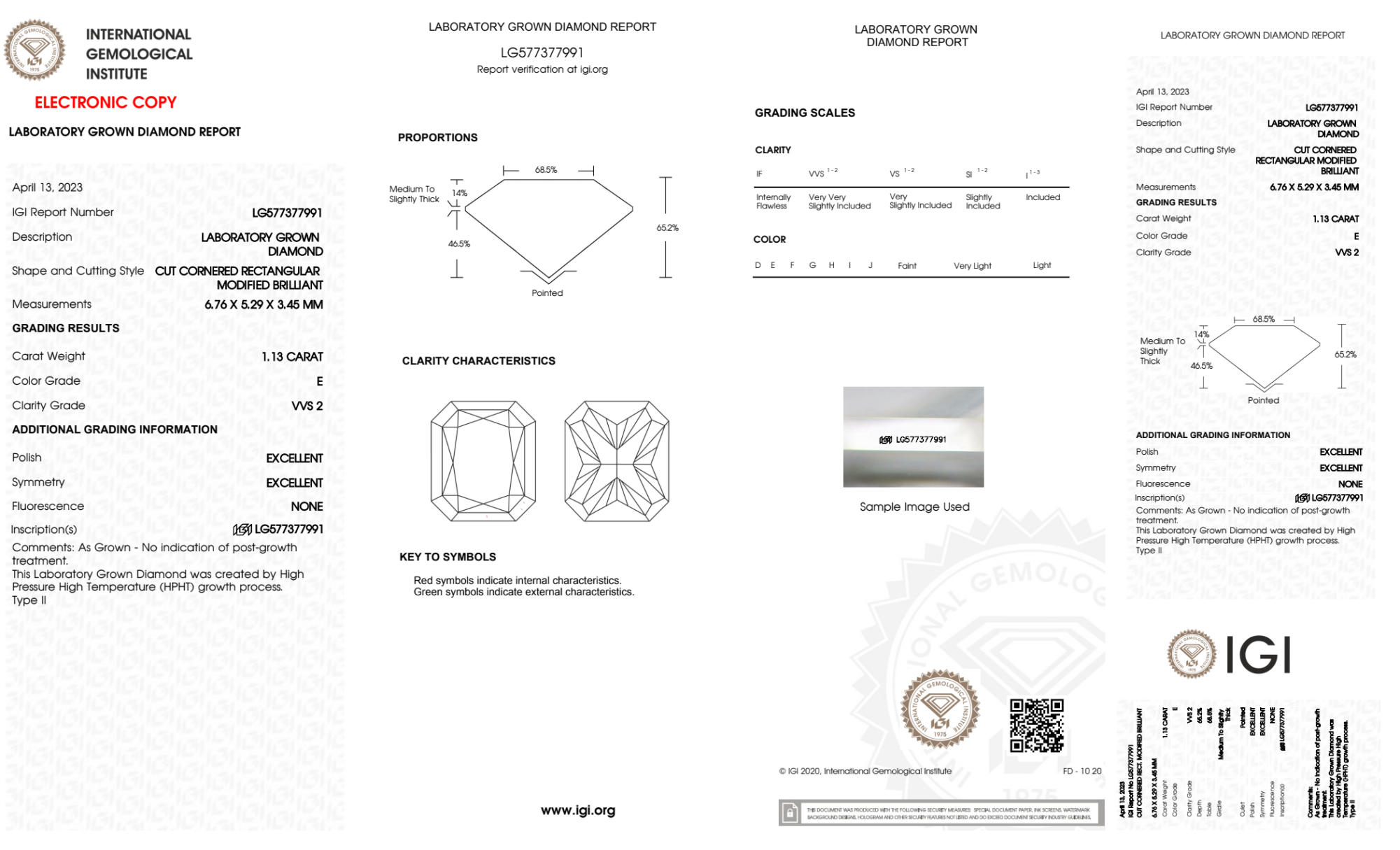 Your 1.13 carat Radiant lab diamond is graded E color (Colorless), and you can read more about E color diamonds here.