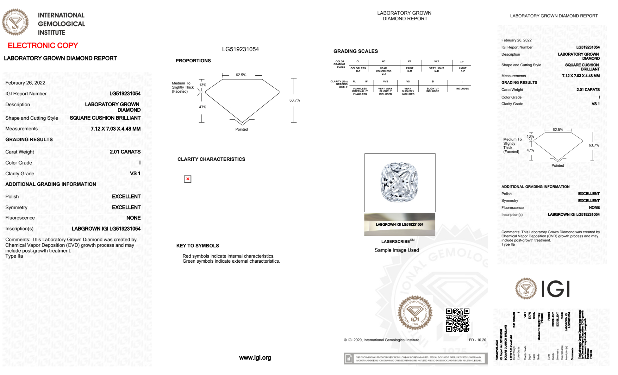 Your 2.01 carat Cushion lab diamond is graded I color (Near Colorless), and you can read more about I color diamonds here.
