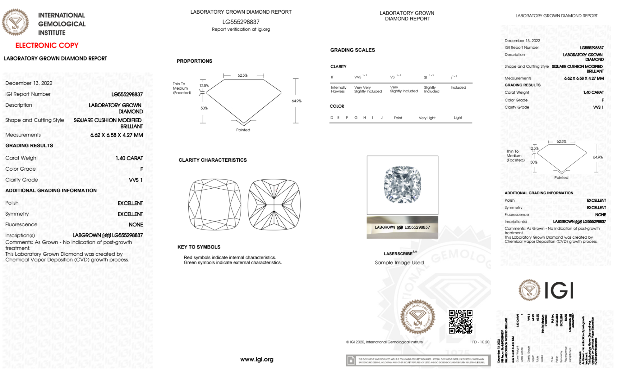 Your 1.40 carat Cushion lab diamond is graded F color (Colorless), and you can read more about F color diamonds here.
