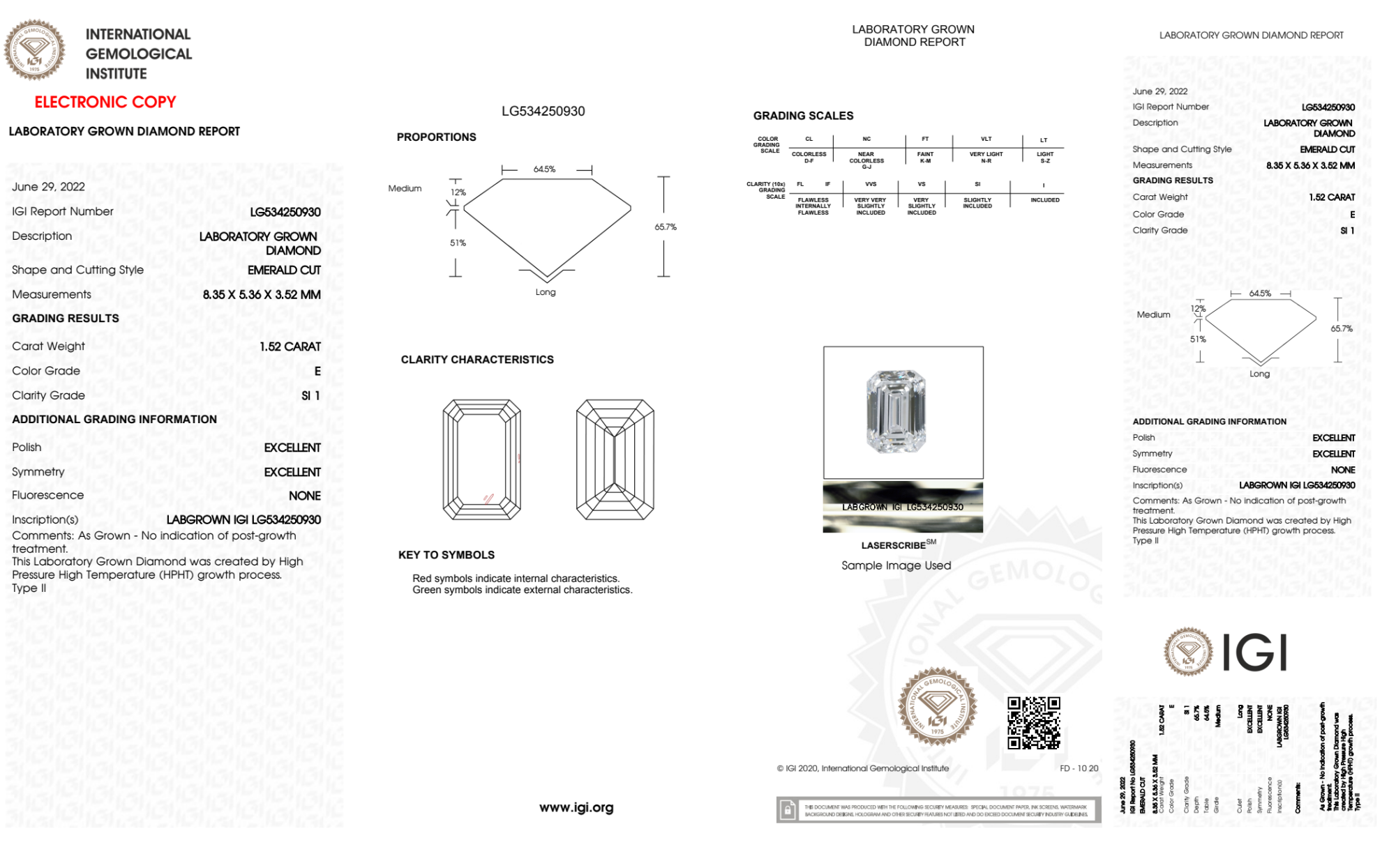 Your 1.52 carat Emerald lab diamond is graded E color (Colorless), and you can read more about E color diamonds here.