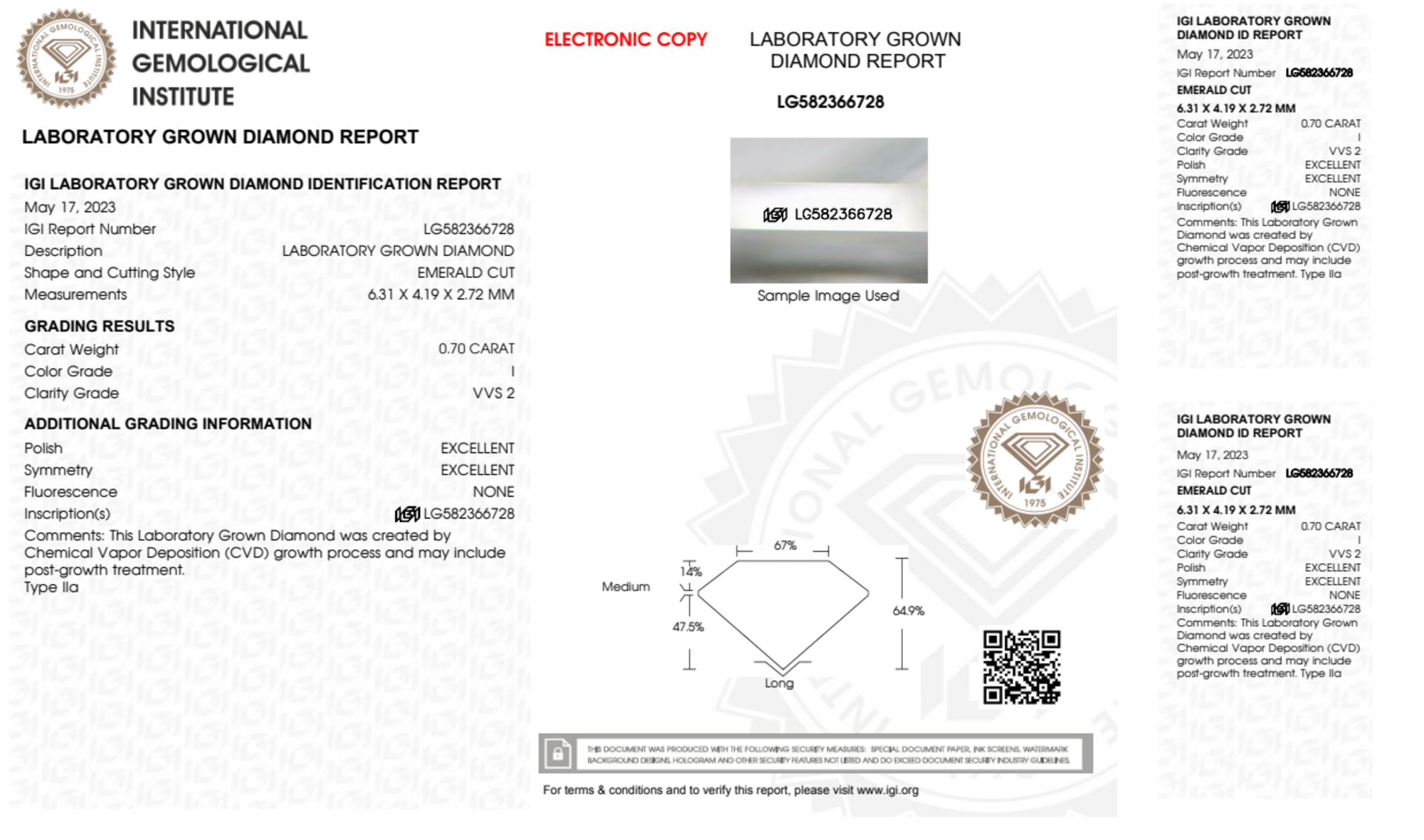 Your 0.70 carat Emerald lab diamond is graded I color (Near Colorless), and you can read more about I color diamonds here.