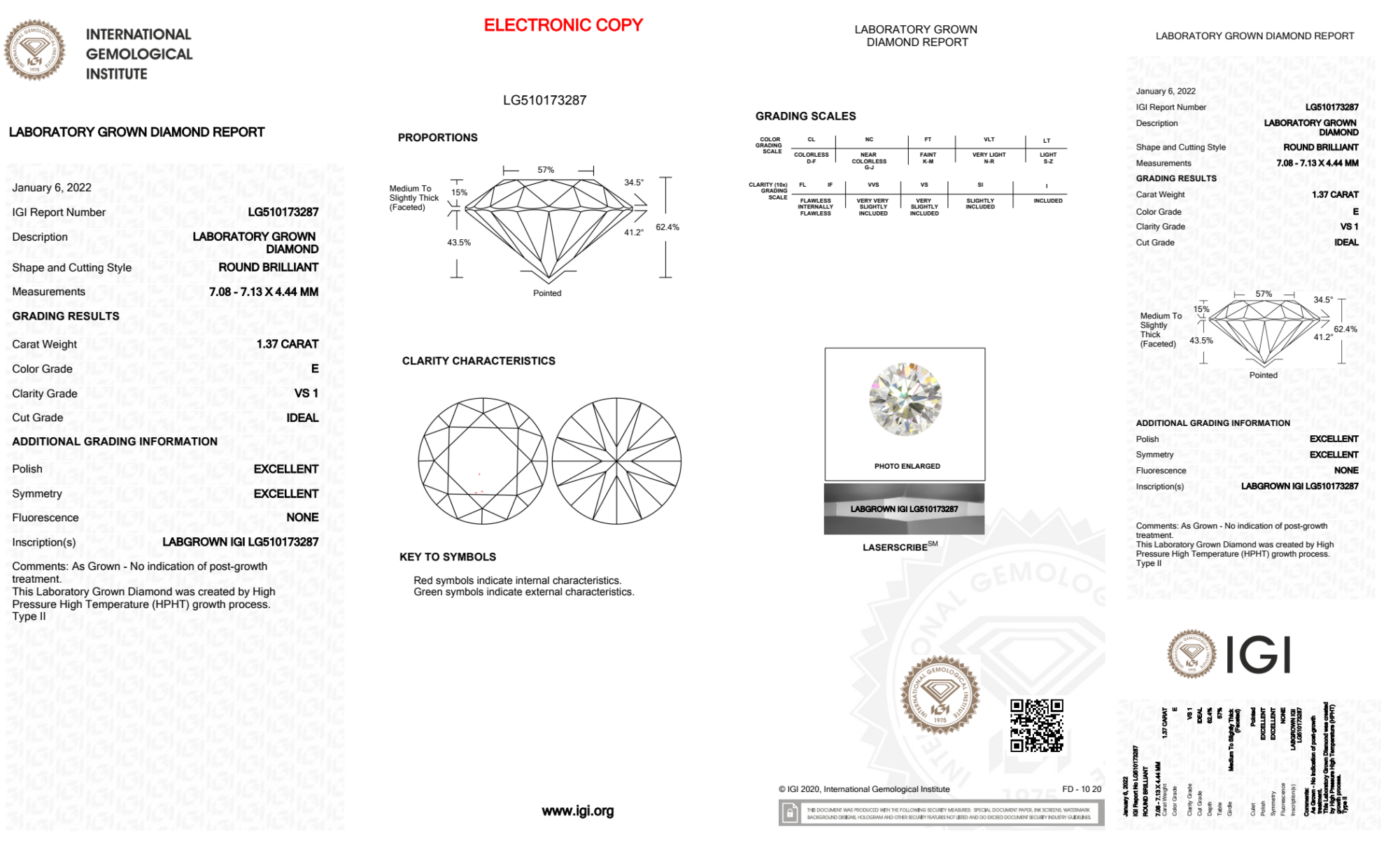 Your 1.37 carat Round lab diamond is graded E color (Colorless), and you can read more about E color diamonds here.