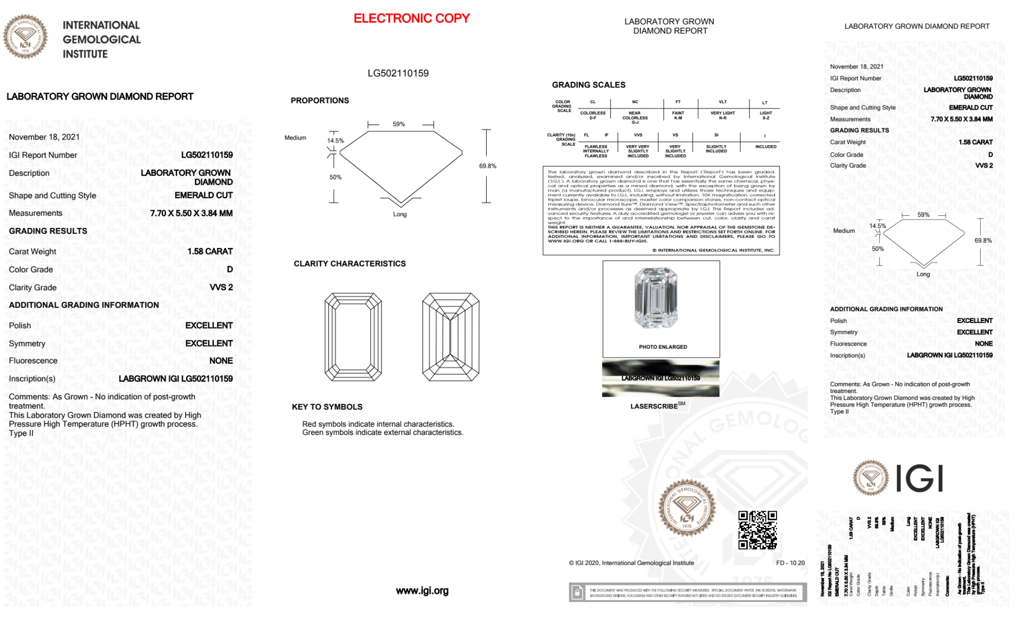 Your 1.58 carat Emerald lab diamond is graded D color (Colorless), and you can read more about D color diamonds here.