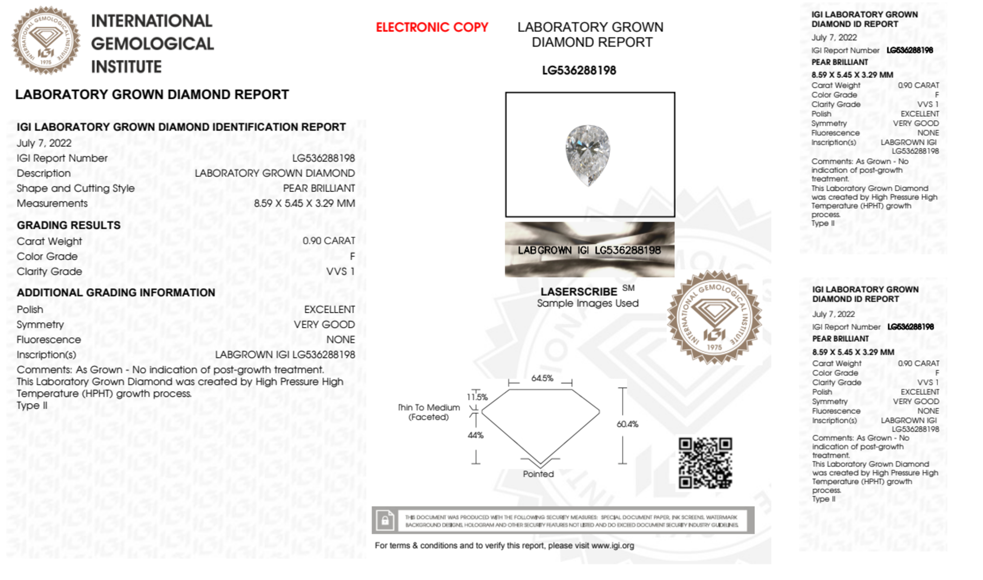 Your 0.90 carat Pear lab diamond is graded F color (Colorless), and you can read more about F color diamonds here.