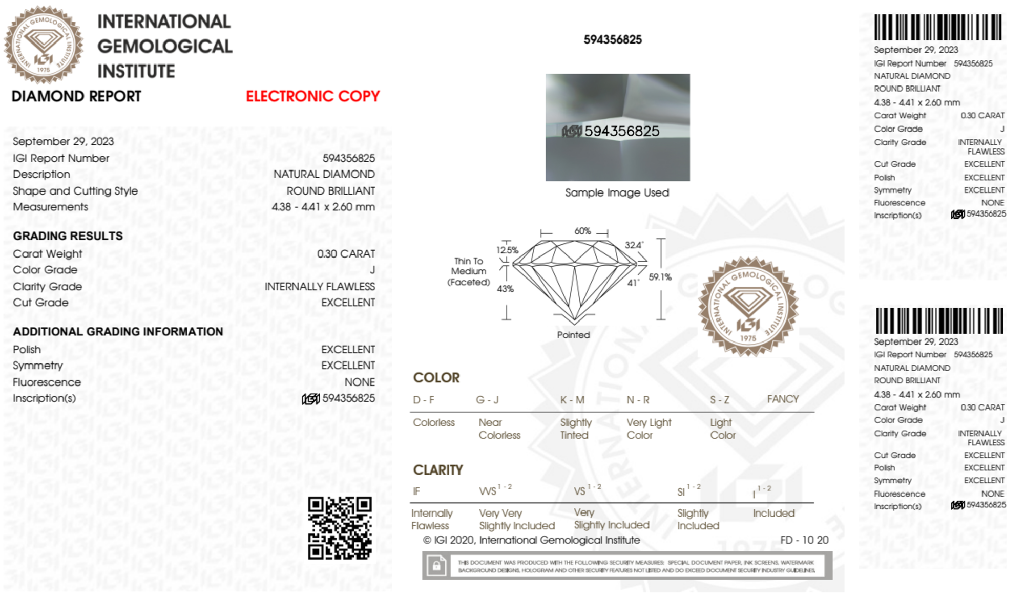 Your 0.30 carat Round natural diamond is graded IF clarity, which stands for Internally Flawless. Read more about IF clarity diamonds here, or learn more about diamond clarity in general here.