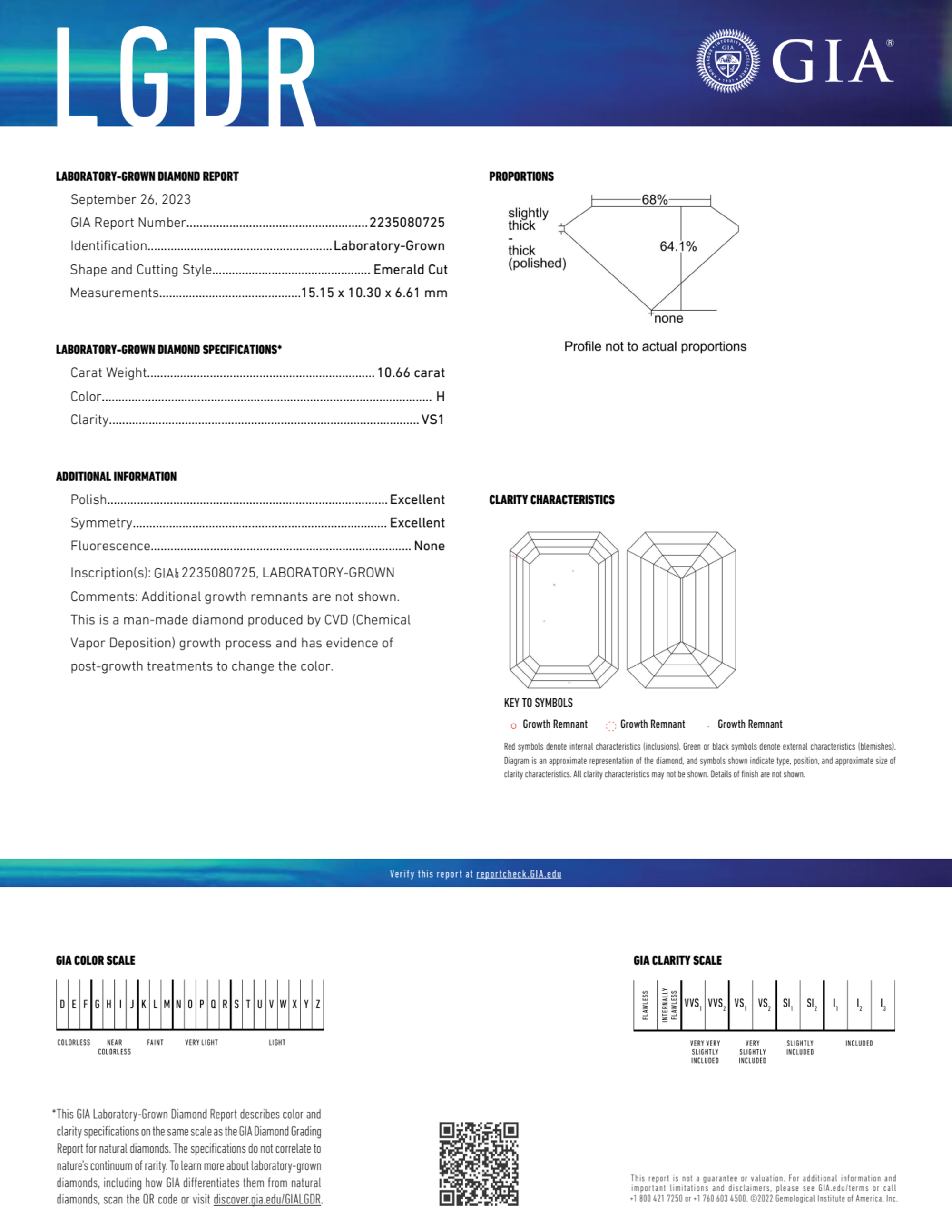Your 10.66 carat Emerald lab diamond is graded H color (Near Colorless), and you can read more about H color diamonds here.