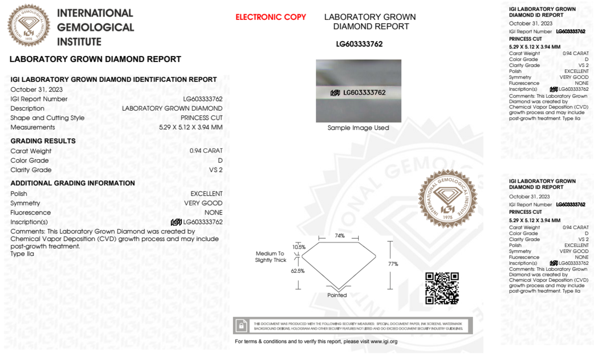 Your 0.94 carat Princess lab diamond is graded D color (Colorless), and you can read more about D color diamonds here.