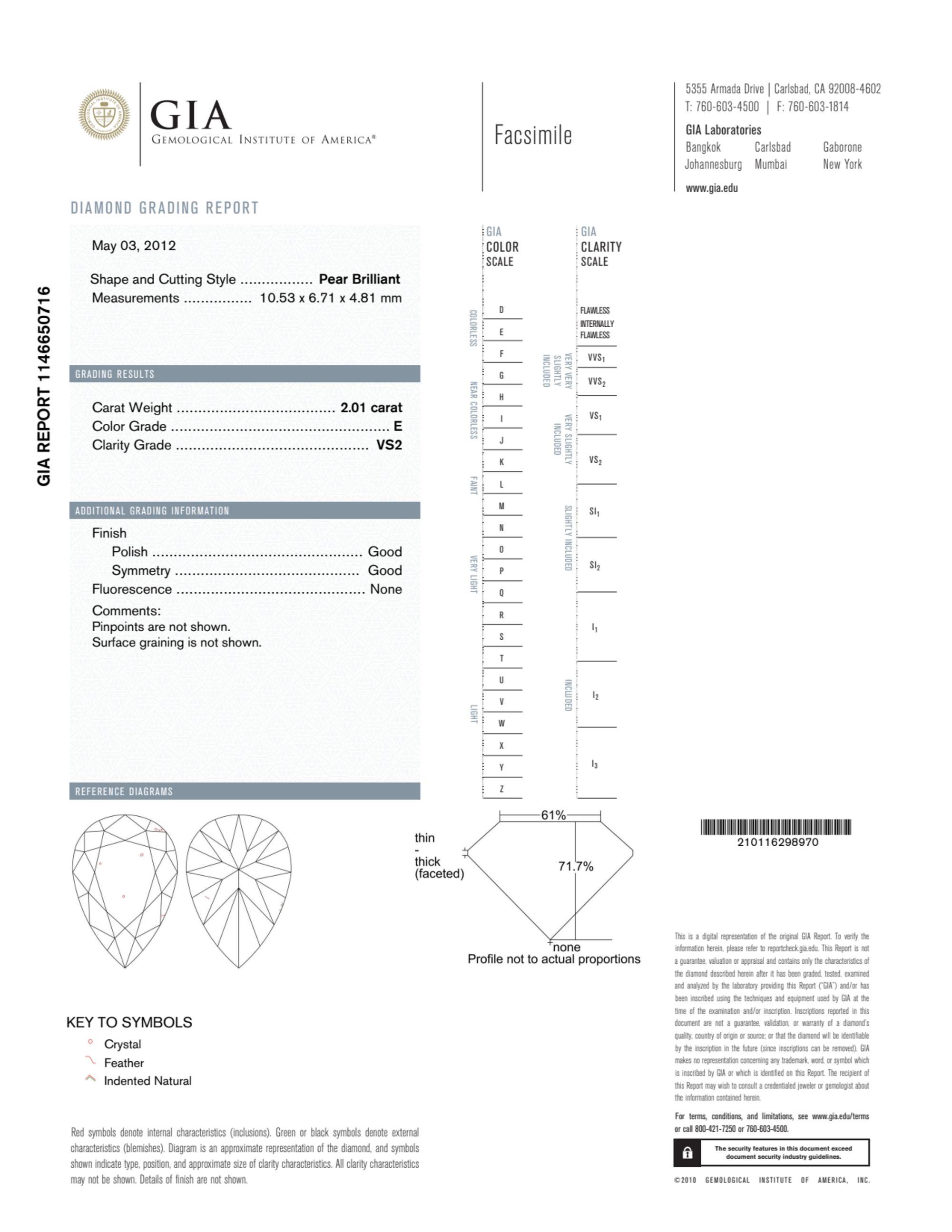 Your 2.01 carat Pear natural diamond is graded E color (Colorless), and you can read more about E color diamonds here.