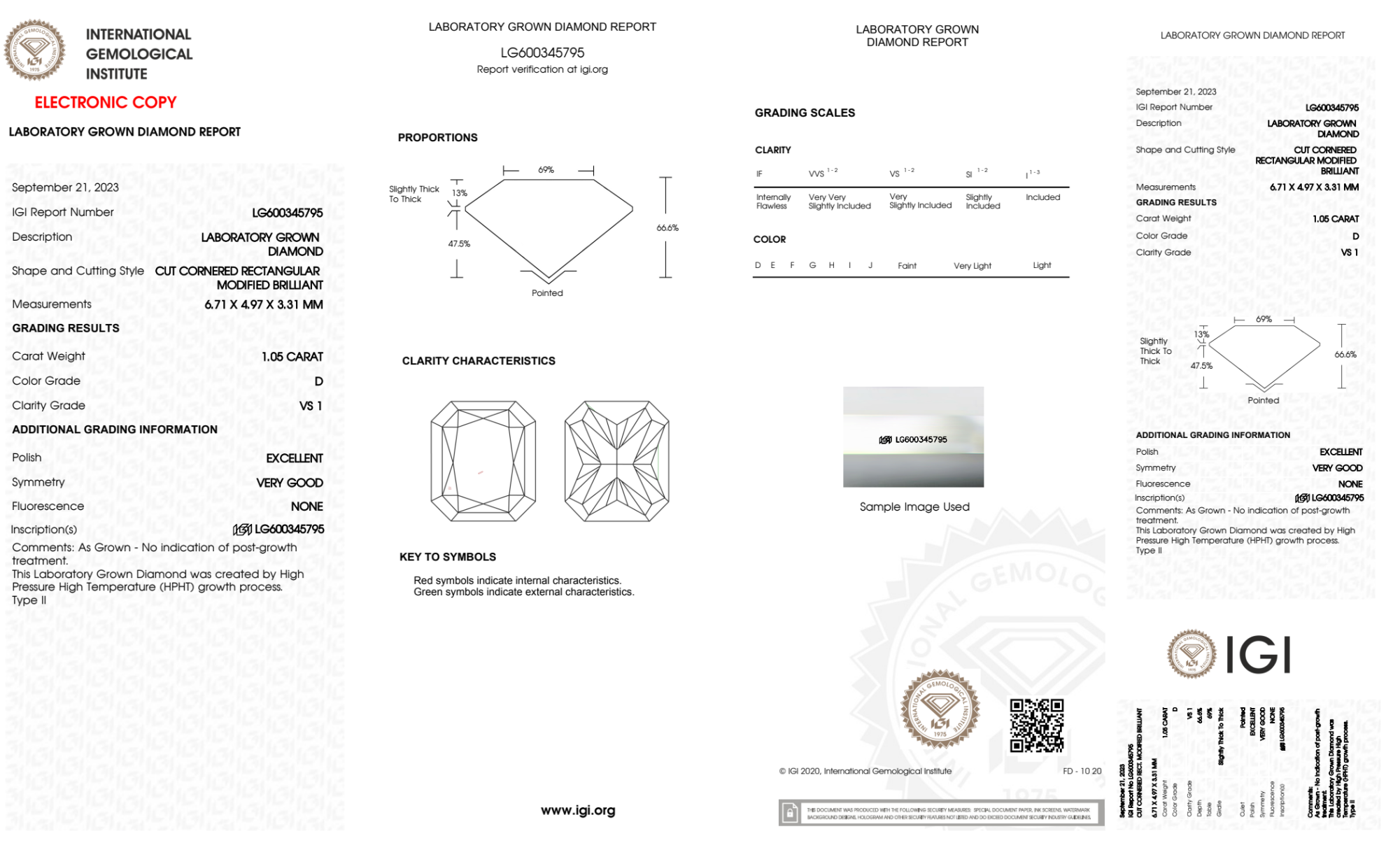 Your 1.05 carat Radiant lab diamond is graded D color (Colorless), and you can read more about D color diamonds here.