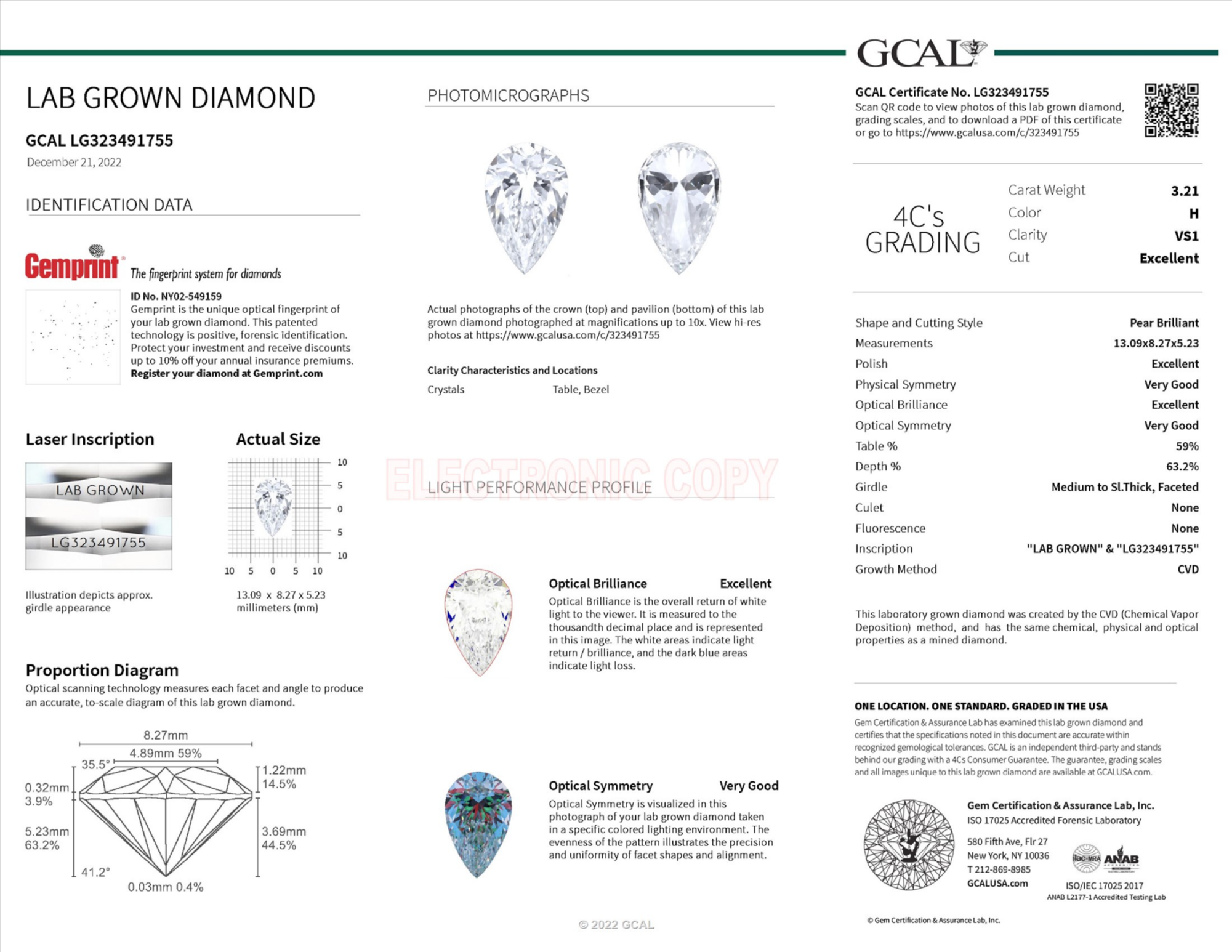 Your 3.21 carat Pear lab diamond is graded H color (Near Colorless), and you can read more about H color diamonds here.