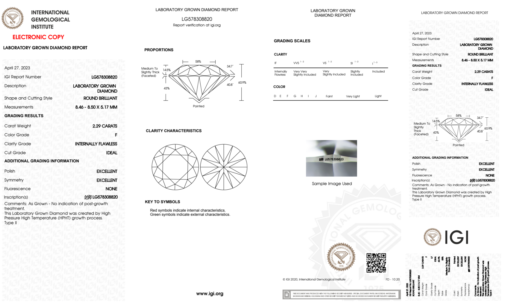 Your 2.29 carat Round lab diamond is graded IF clarity, which stands for Internally Flawless. Read more about IF clarity diamonds here, or learn more about diamond clarity in general here.