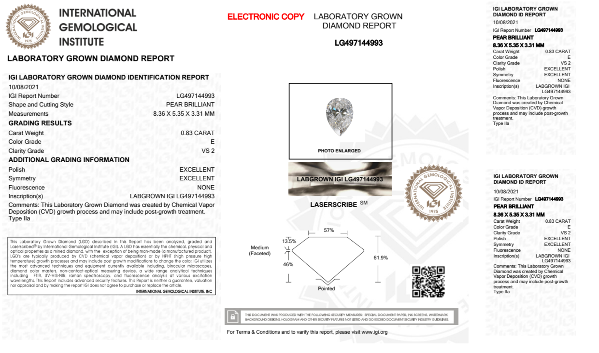 Your 0.83 carat Pear lab diamond is graded E color (Colorless), and you can read more about E color diamonds here.