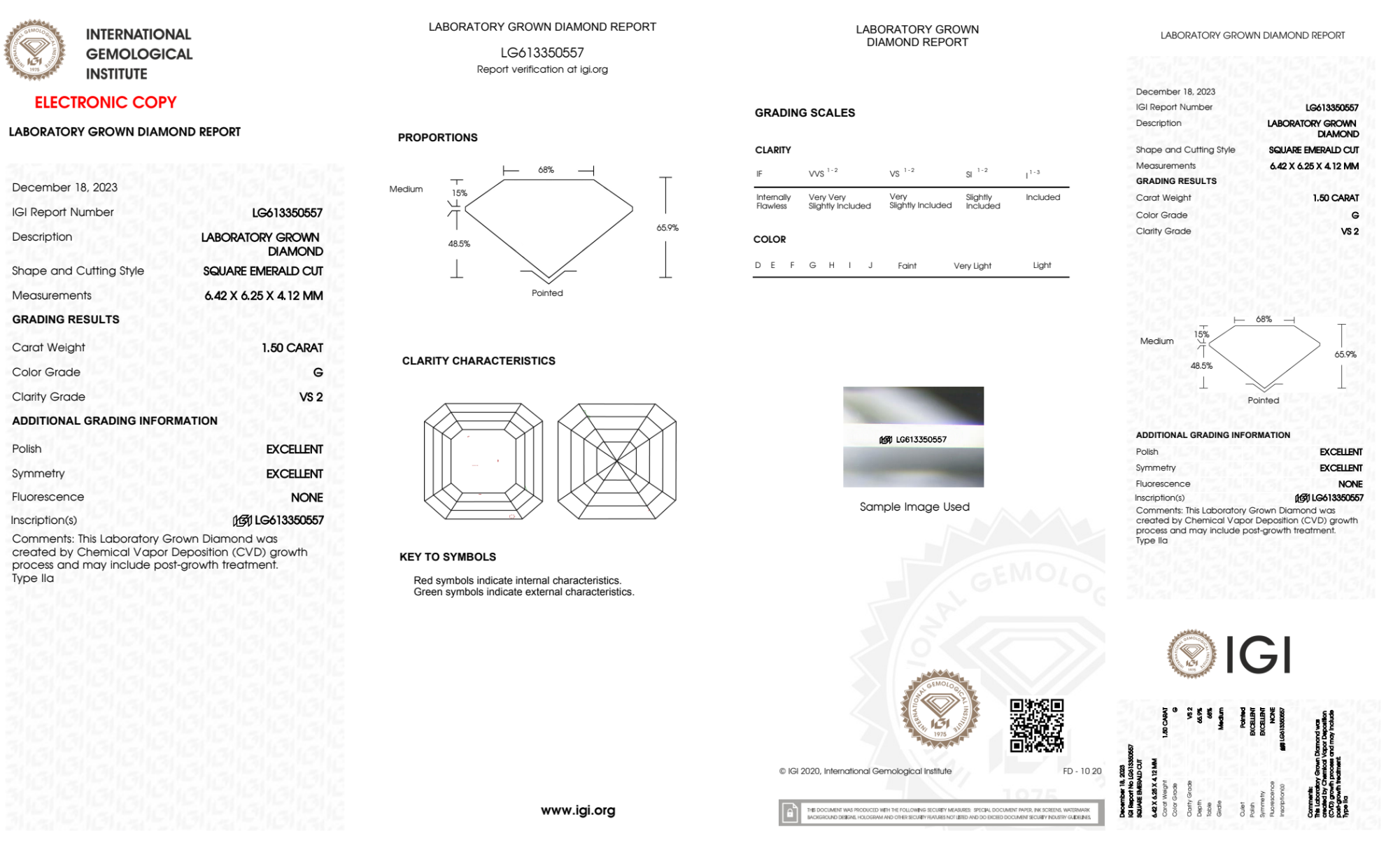 Your 1.50 carat Asscher lab diamond is graded G color (Near Colorless), and you can read more about G color diamonds here.