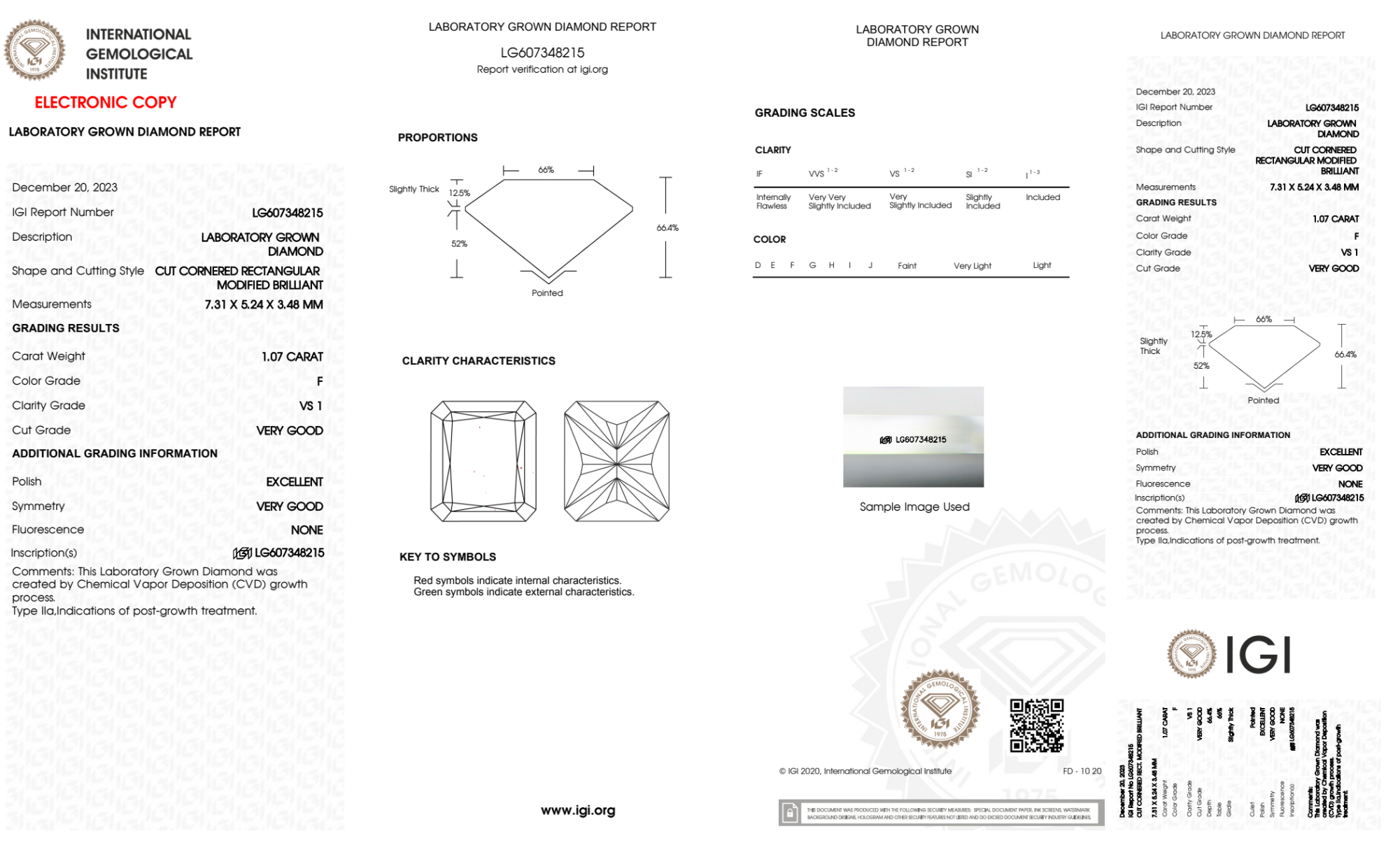 Your 1.07 carat Radiant lab diamond is graded F color (Colorless), and you can read more about F color diamonds here.