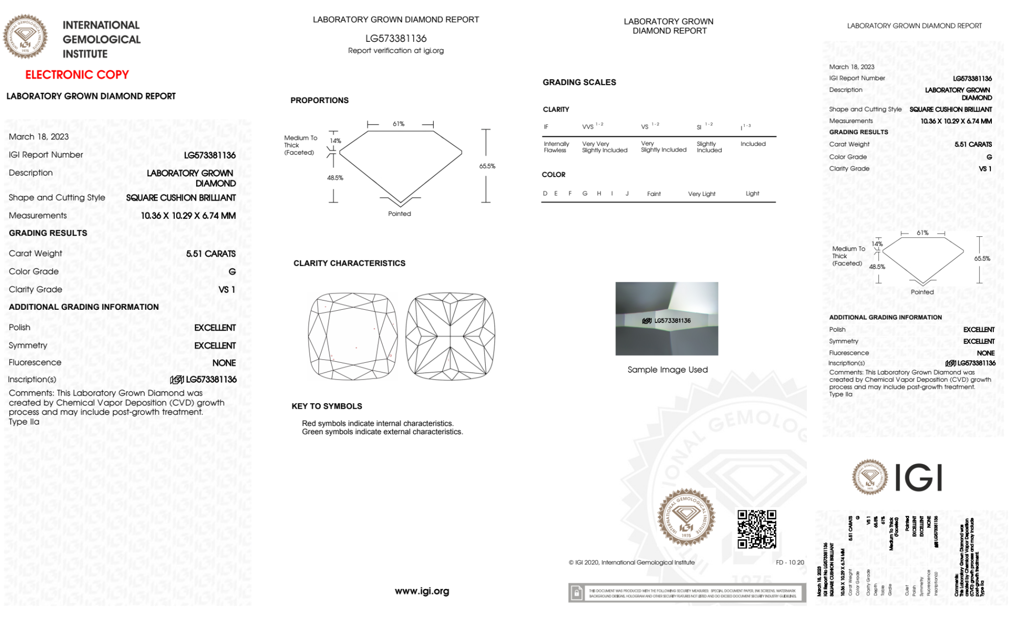 Your 5.51 carat Cushion lab diamond is graded G color (Near Colorless), and you can read more about G color diamonds here.