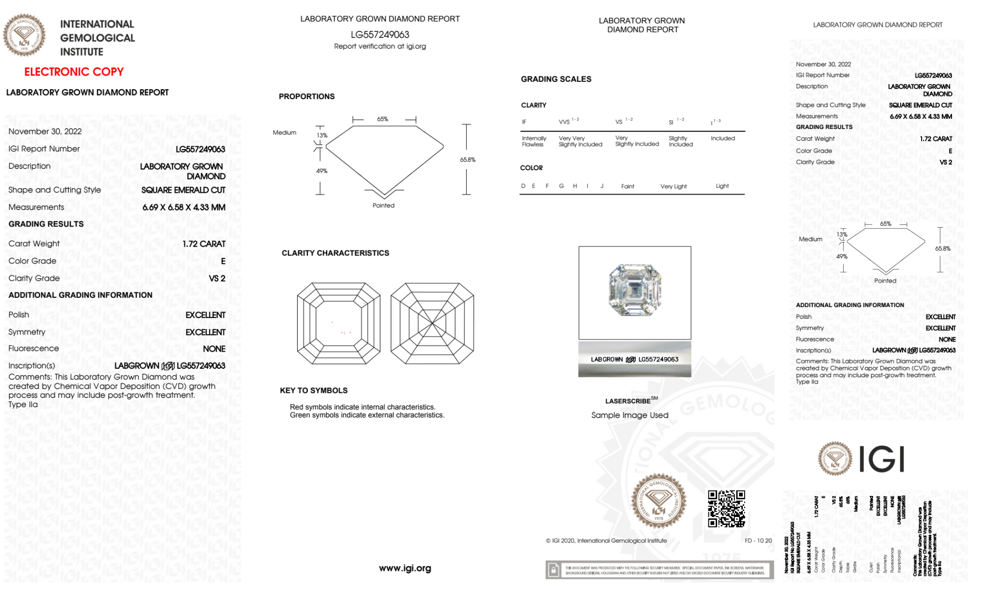 Your 1.72 carat Asscher lab diamond is graded E color (Colorless), and you can read more about E color diamonds here.