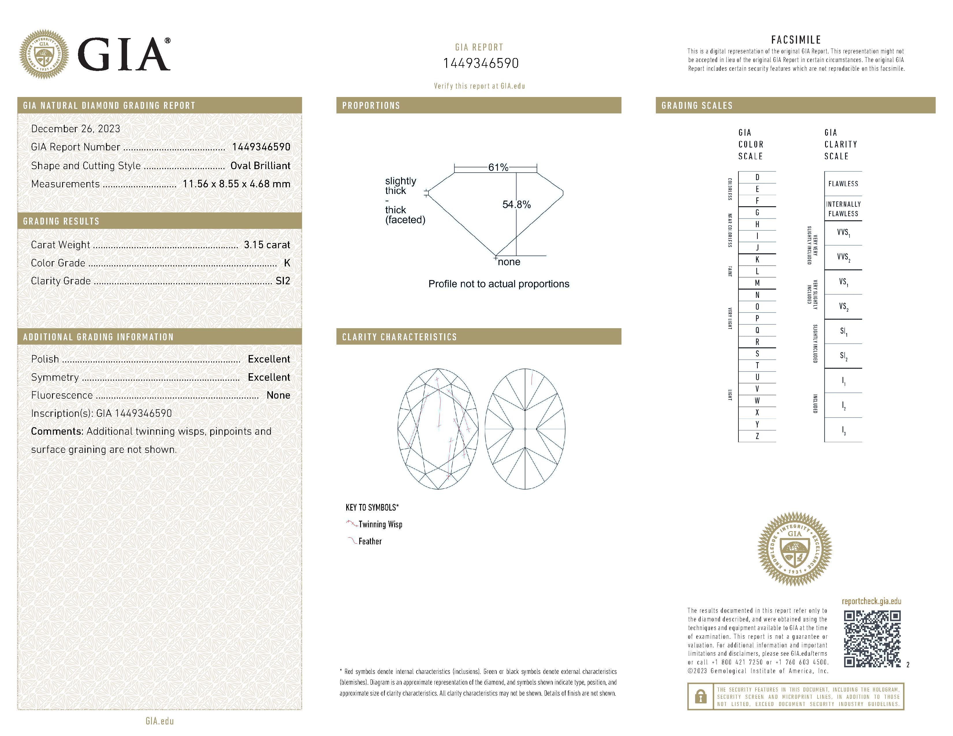 Your 3.15 carat Oval natural diamond is graded SI2 clarity, which stands for Slightly Included 2. Read more about SI2 clarity diamonds here, or learn more about diamond clarity in general here.