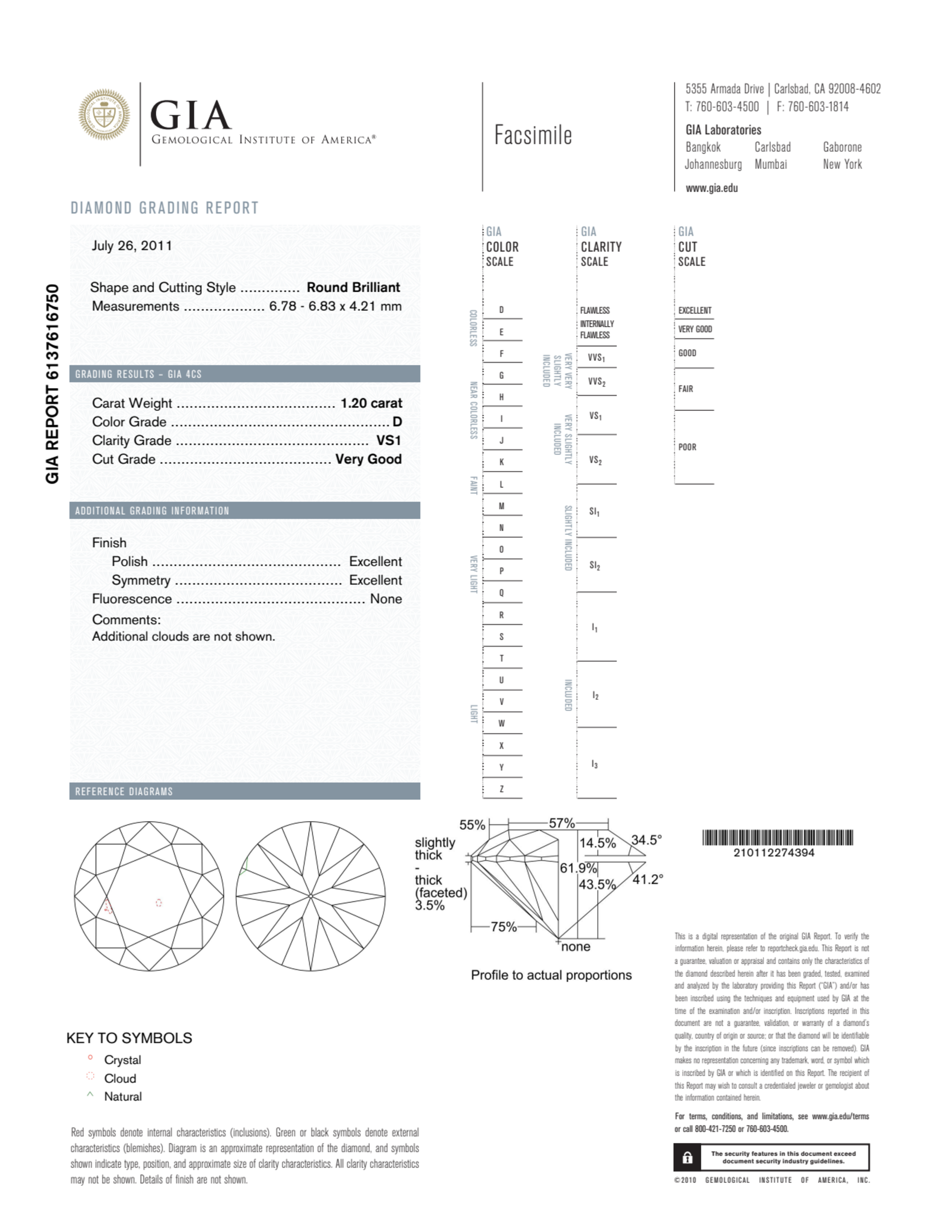 Your 1.20 carat Round natural diamond is graded VS1 clarity, which stands for Very Slightly Included 1. Read more about VS1 clarity diamonds here, or learn more about diamond clarity in general here.