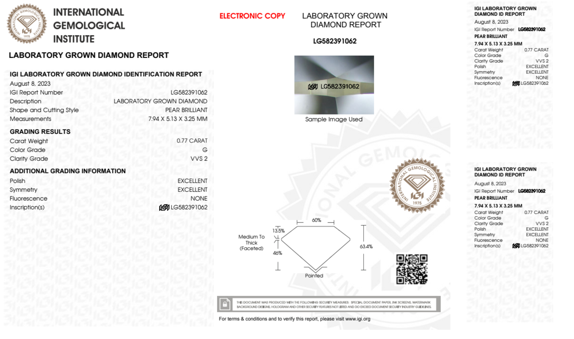 Your 0.77 carat Pear lab diamond is graded G color (Near Colorless), and you can read more about G color diamonds here.