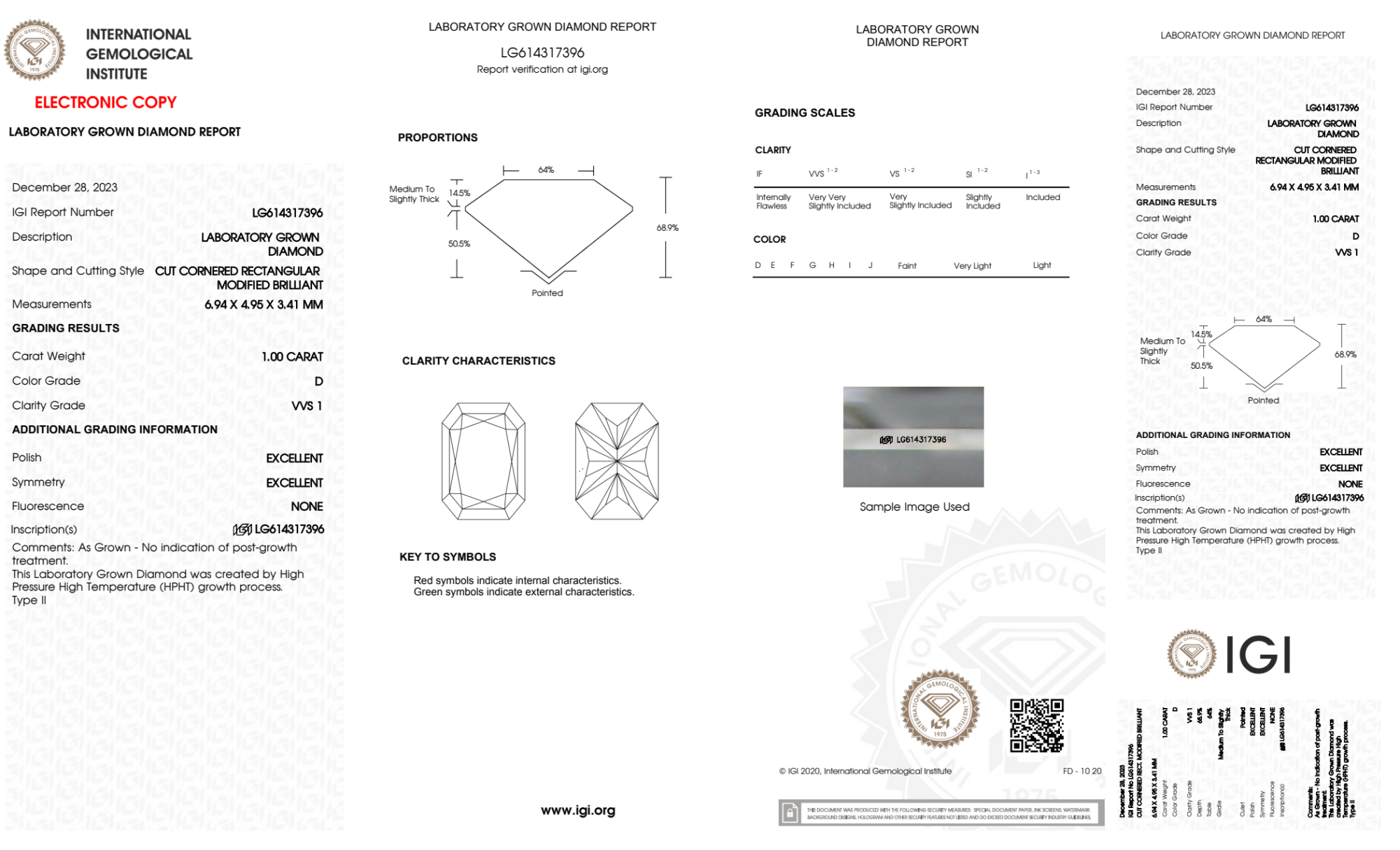Your 1.00 carat Radiant lab diamond is graded D color (Colorless), and you can read more about D color diamonds here.