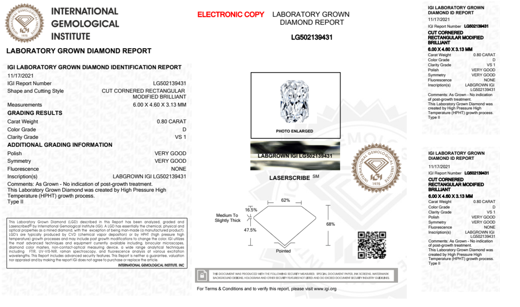 Your 0.80 carat Radiant lab diamond is graded D color (Colorless), and you can read more about D color diamonds here.