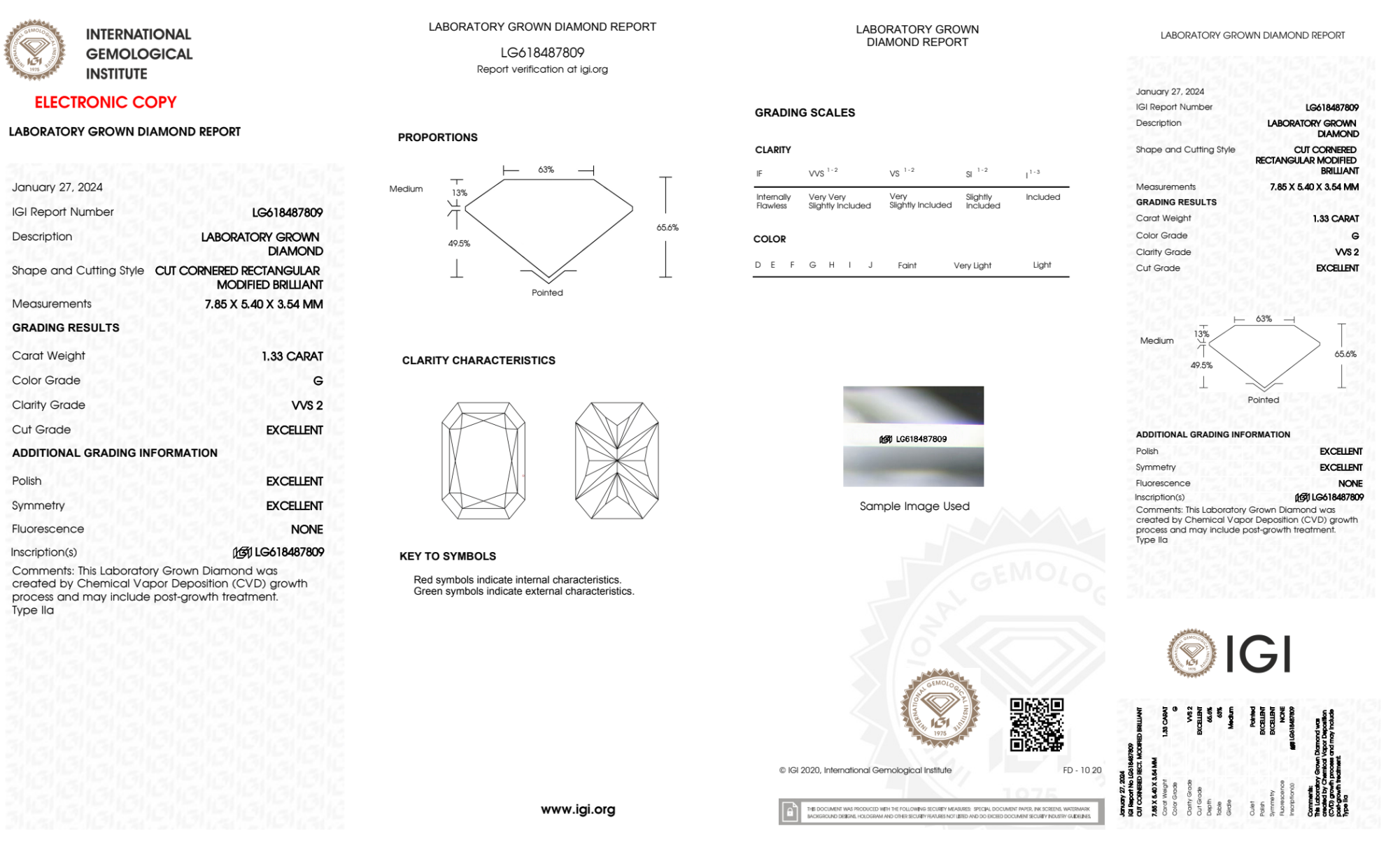 Your 1.33 carat Radiant lab diamond is graded G color (Near Colorless), and you can read more about G color diamonds here.