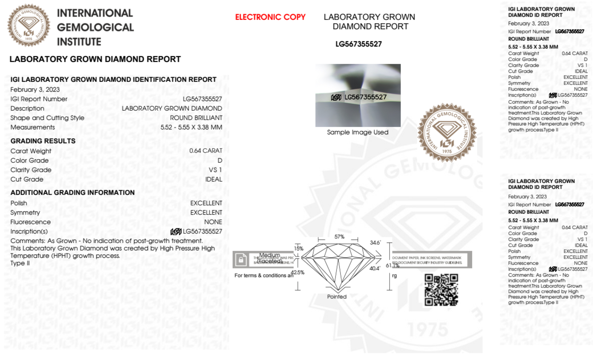 Your 0.64 carat Round lab diamond is graded VS1 clarity, which stands for Very Slightly Included 1. Read more about VS1 clarity diamonds here, or learn more about diamond clarity in general here.