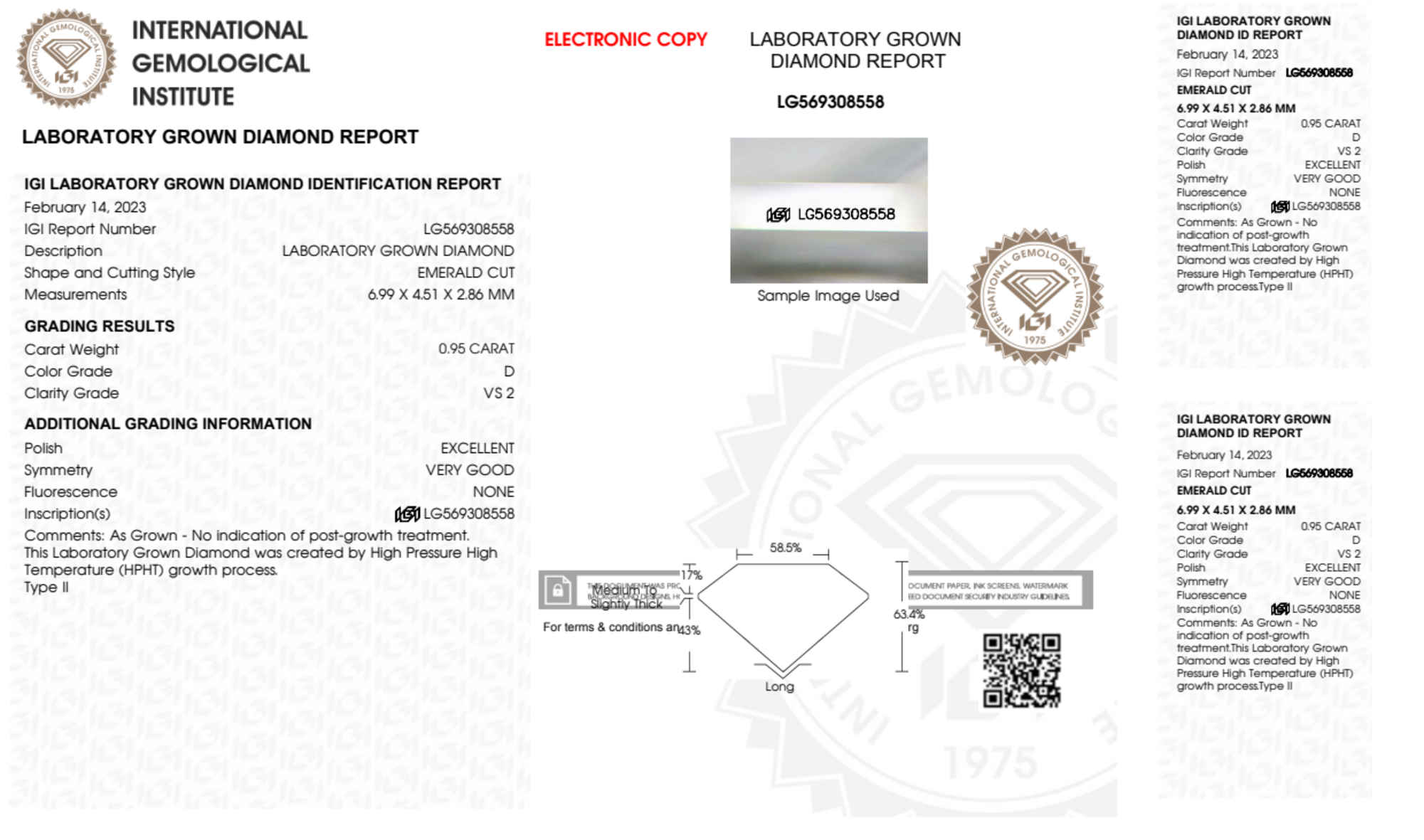 Your 0.95 carat Emerald lab diamond is graded D color (Colorless), and you can read more about D color diamonds here.