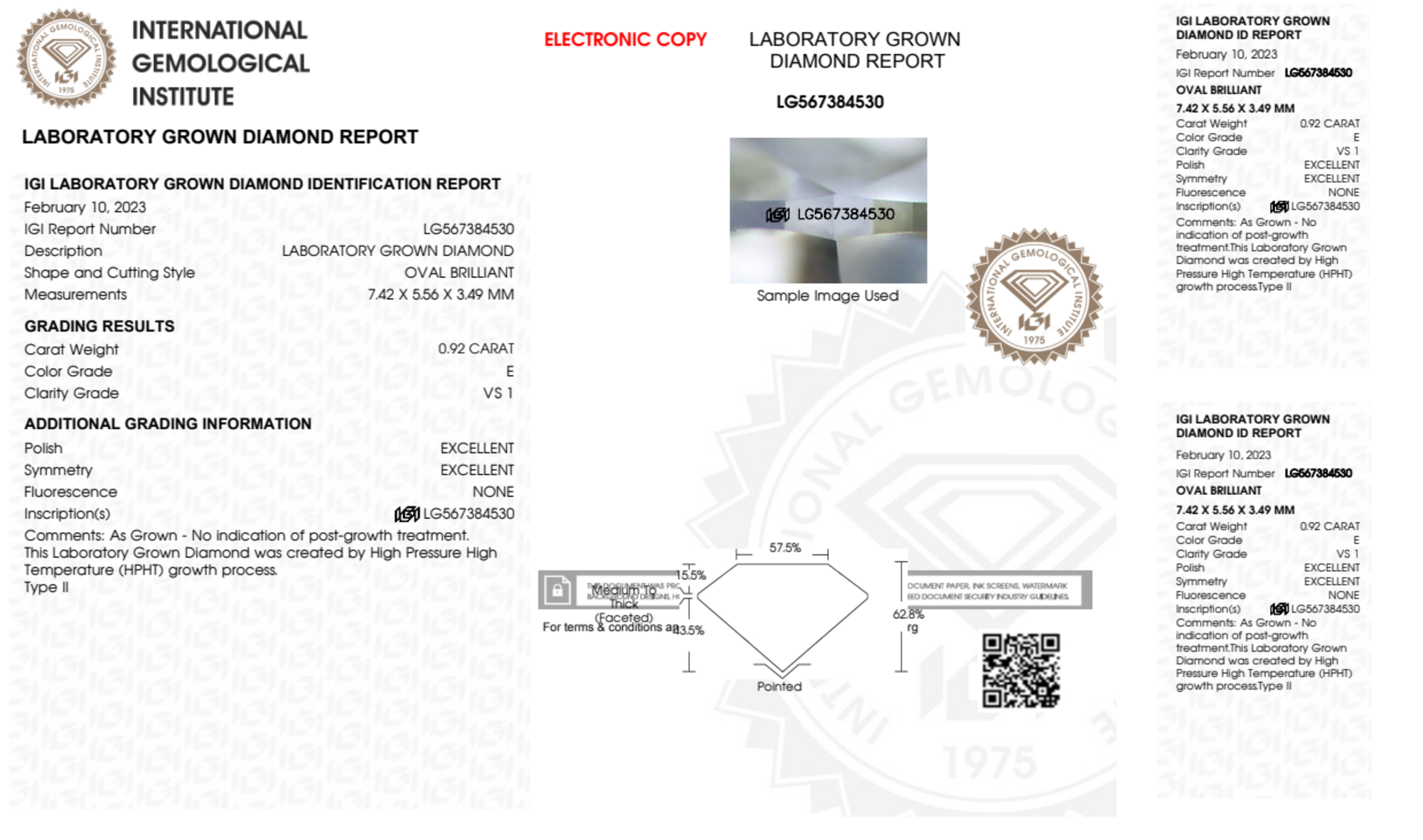 Your 0.92 carat Oval lab diamond is graded E color (Colorless), and you can read more about E color diamonds here.