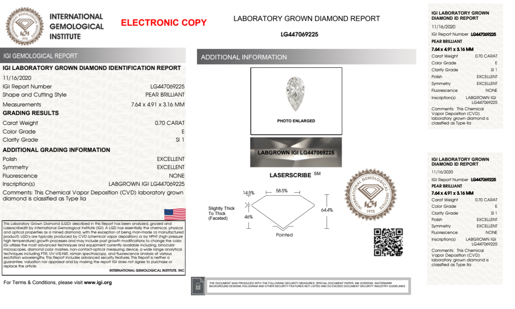 Your 0.70 carat Pear lab diamond is graded E color (Colorless), and you can read more about E color diamonds here.