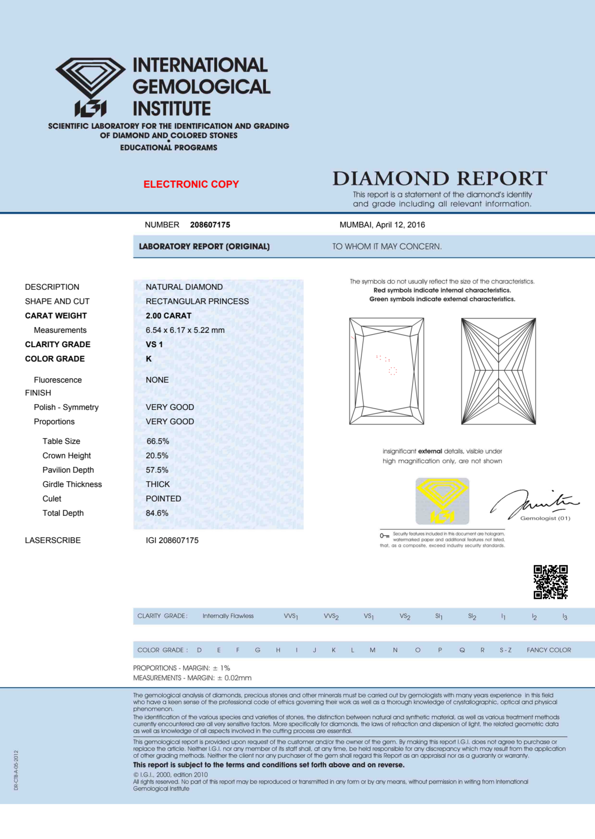Your 2.00 carat Princess natural diamond is graded VS1 clarity, which stands for Very Slightly Included 1. Read more about VS1 clarity diamonds here, or learn more about diamond clarity in general here.